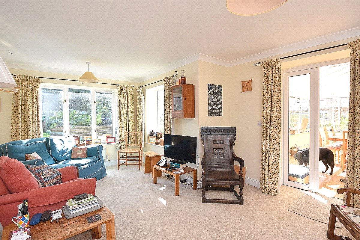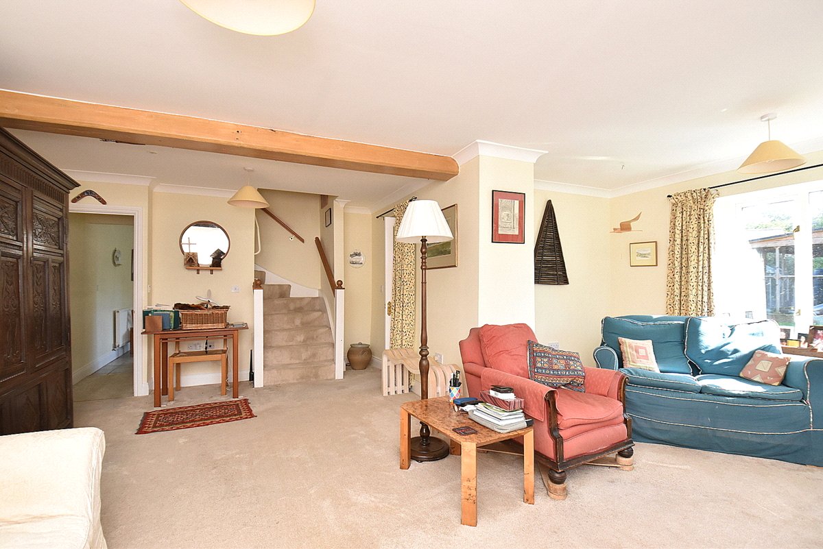 LIVING ROOM: 20’8” x 19’9” (narrowing to 11’10” L shaped) A spacious room with dual a aspect overlooking the delightful garden. Radiator, smooth plastered ceiling, ceiling beam, television aerial point, double door to conservatory and door to inner lobby with understairs cupboard and opening to: