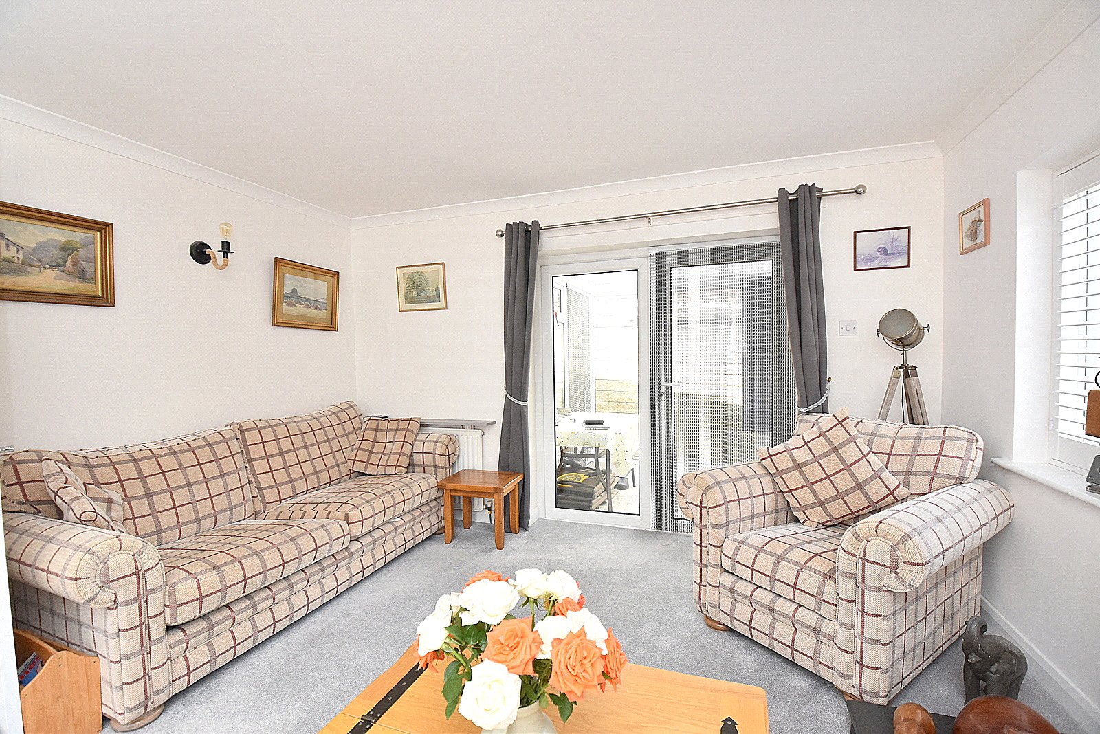 The sitting room is a standout feature of the home, generously sized, dual aspect, and tastefully decorated. A central fireplace with a large electric stove (available by separate negotiation) adds warmth and character, while French doors lead into the conservatory, which enjoys an outlook over the courtyard style garden.