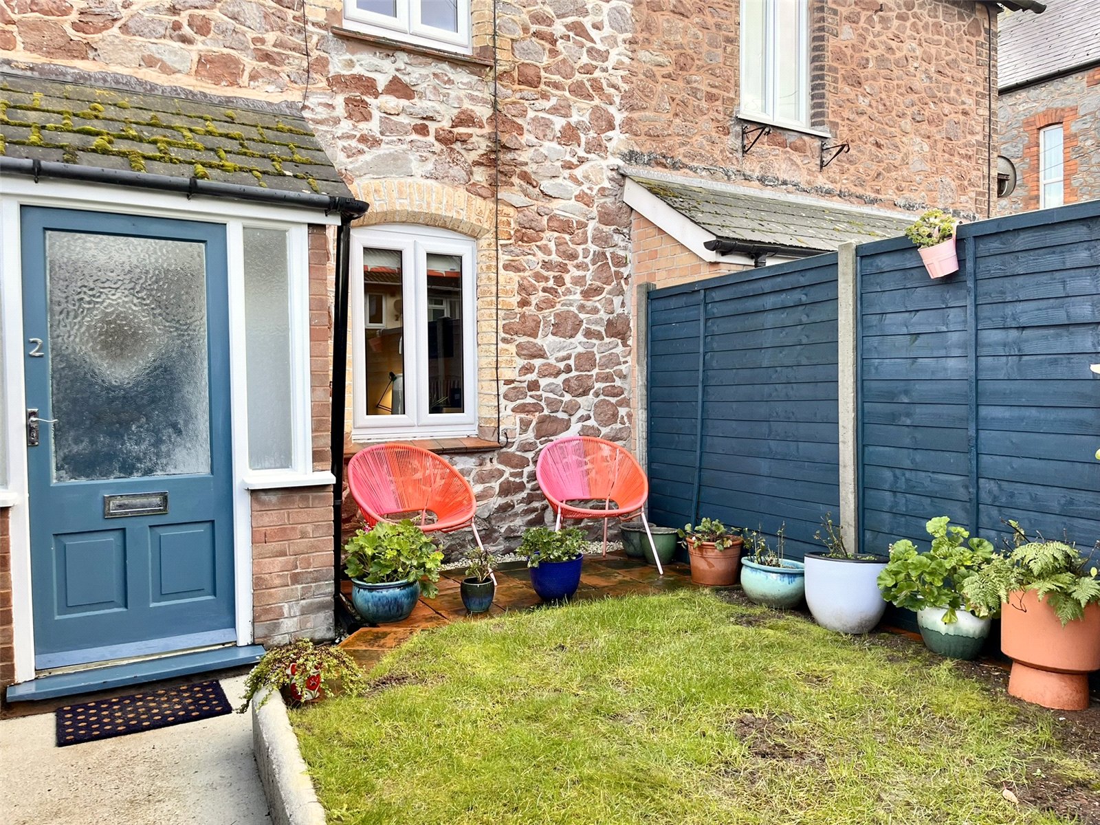 To the front of the property, a pleasant, enclosed garden features a lawn and a terracotta stone patio, screened by fencing to create a private and peaceful setting—perfect for enjoying a book or an evening drink.