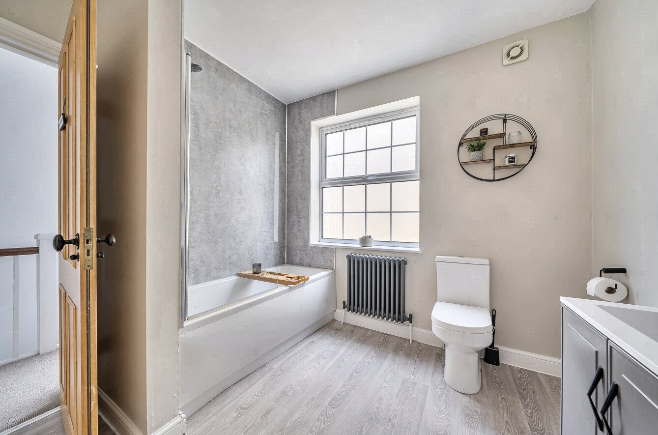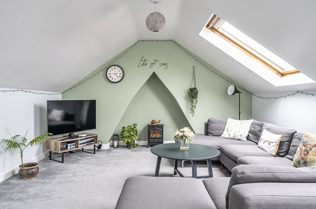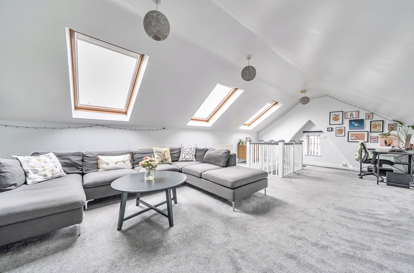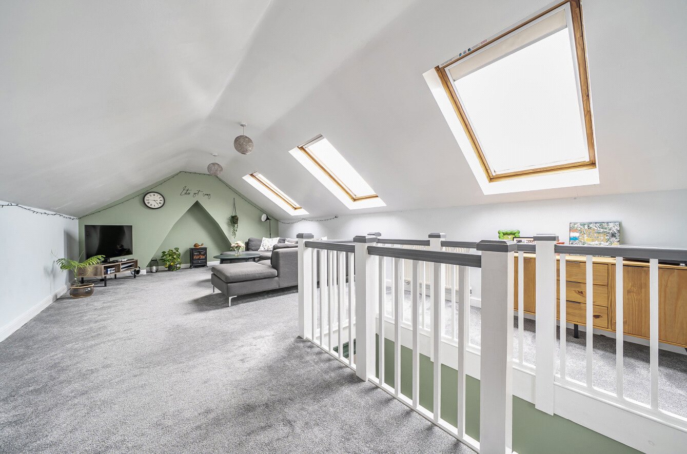 The first floor features a modern bathroom, an open plan kitchen and dining area ideal for relaxed entertaining, and a well proportioned bedroom. A second flight of stairs leads to the impressive loft room, currently used as a comfortable sitting room. With three Velux windows providing excellent natural light, this versatile space would also make a superb second bedroom or work from home space.