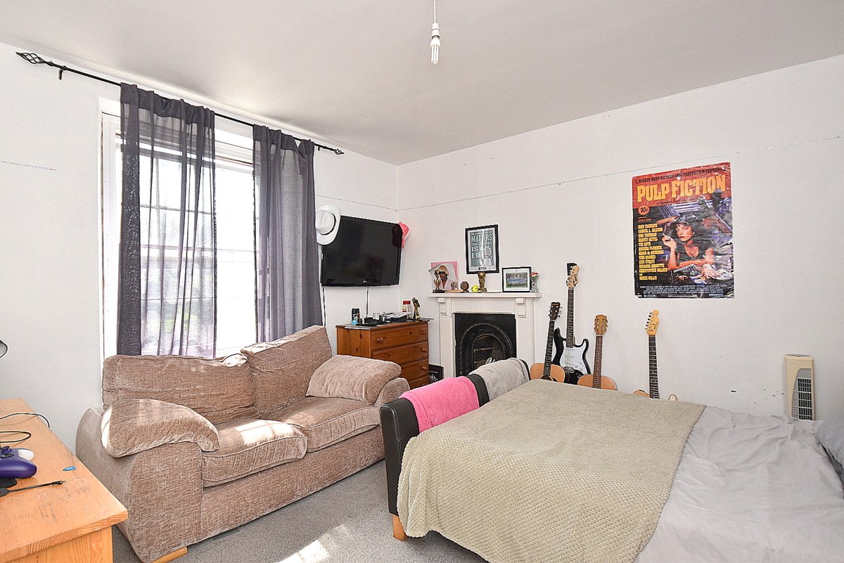 BEDROOM 1: 13’1” x 12’9” Feature cast iron fireplace with painted timber surround, sash window to front aspect and radiator.