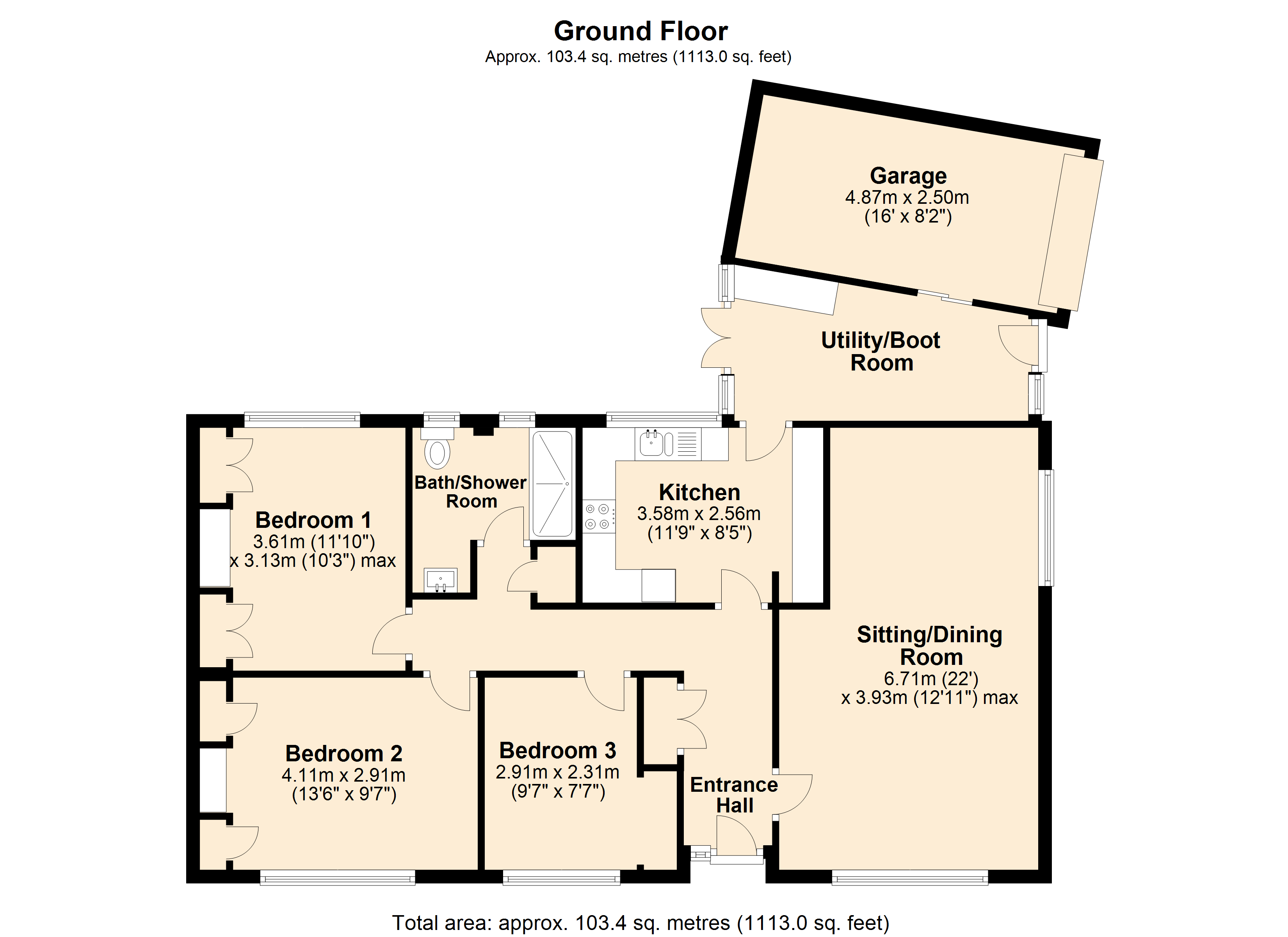 The light and airy accommodation is well-proportioned and features a spacious dual aspect sitting room. Two of the three bedrooms benefit from built-in wardrobes, while the kitchen opens into a useful boot room/utility area, which in turn provides internal access to the garage and garden.
