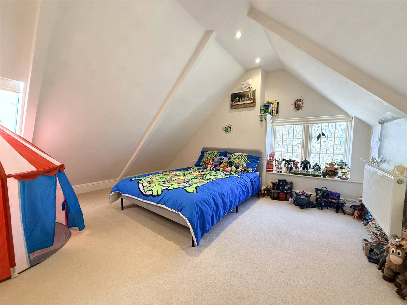 BEDROOM 3: 13’2” (max) x 12’3” A characterful room with sloping ceilings, radiator, eaves cupboard, storage cupboard, skylight window and window to side aspect.