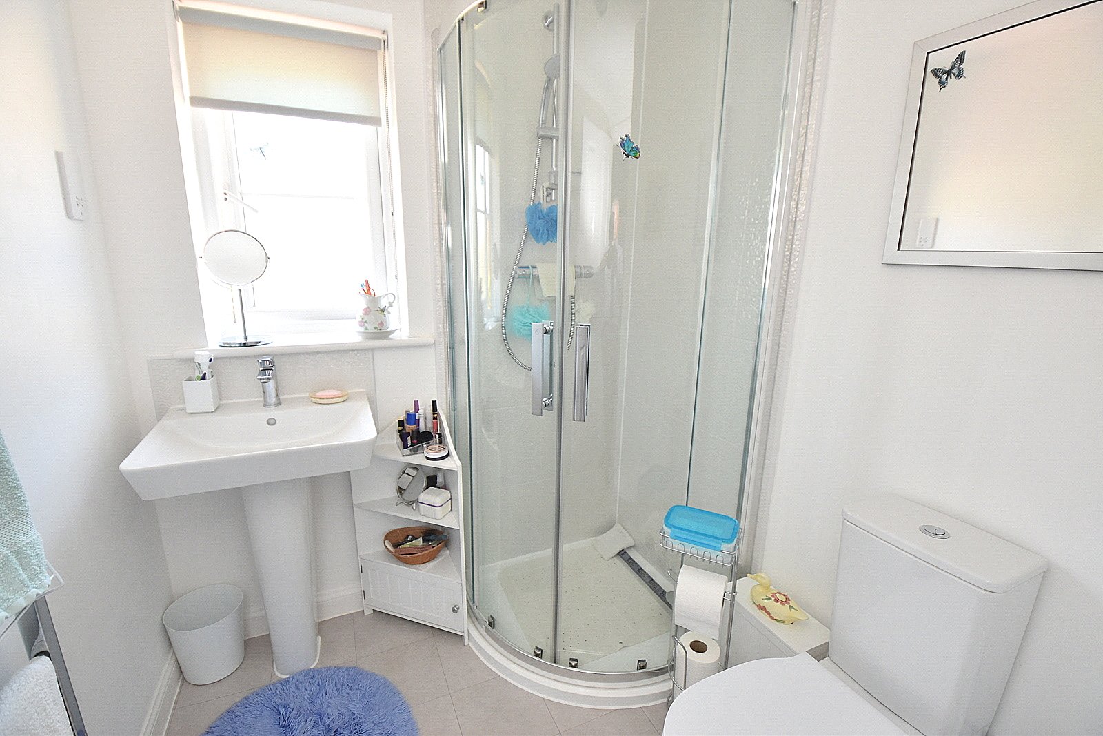 EN-SUITE SHOWER ROOM: Shower cubicle, low level WC, pedestal wash hand basin, heated towel rail, smooth plastered ceiling with extractor, electric shaver point and double glazed window.