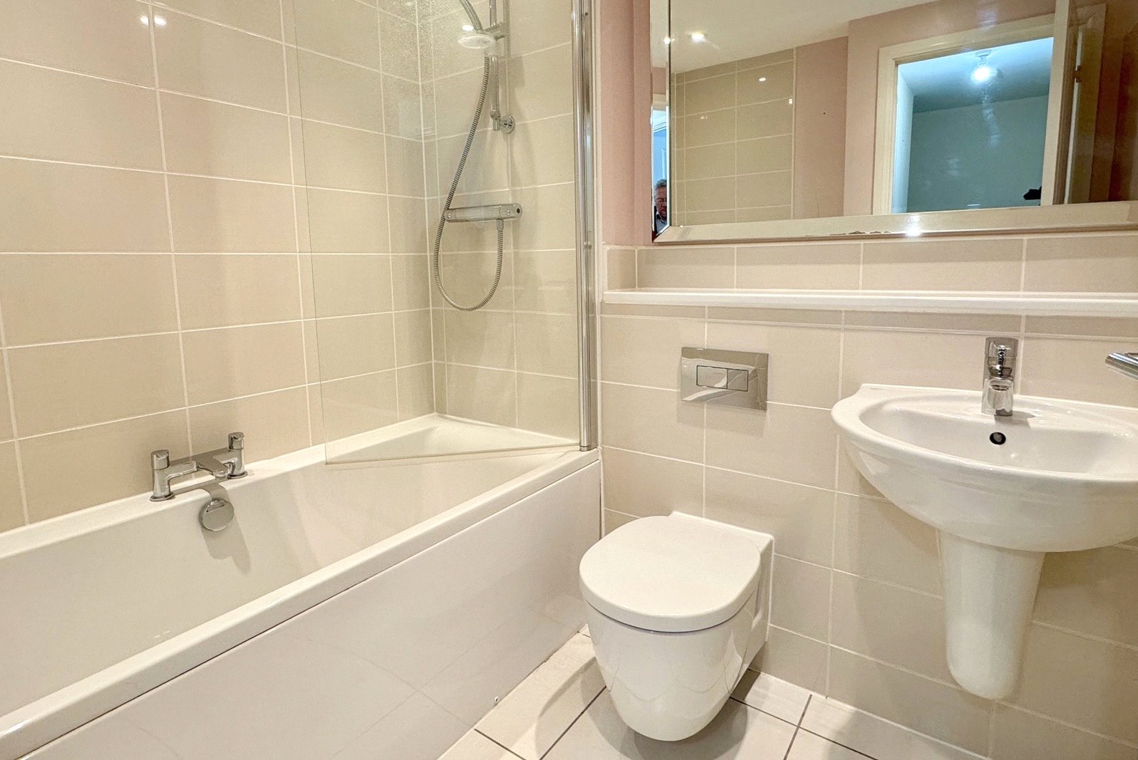 BATHROOM: A stylish modern suite comprising double ended bath with shower over, wall hung wash basin and WC with concealed cistern, heated towel rail, tiled to splash prone areas, tiled floor, smooth plastered ceiling with downlighters and obscured double glazed window to side aspect.