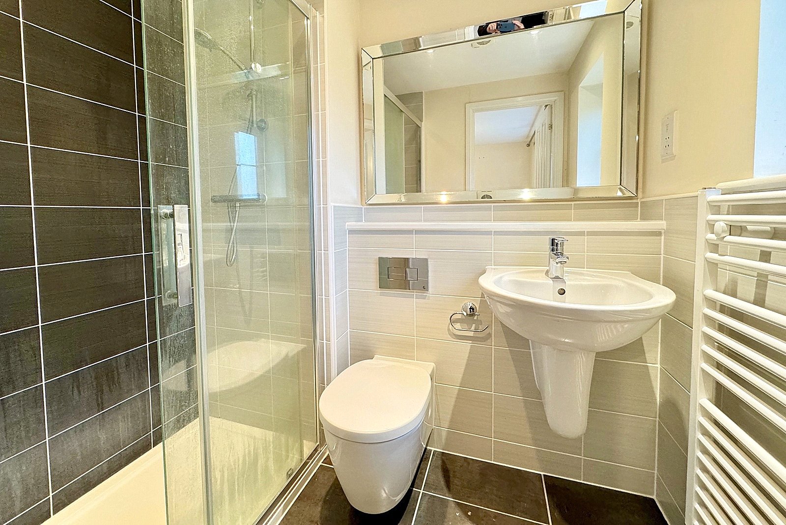 EN-SUITE SHOWER ROOM: A modern suite comprising large shower cubicle, wall hung wash basin, low level WC with concealed cistern, heated towel rail, tiled to splash prone areas, obscured double glazed window, tiled floor, smooth plastered ceiling with downlighters, extractor and electric shaver point.