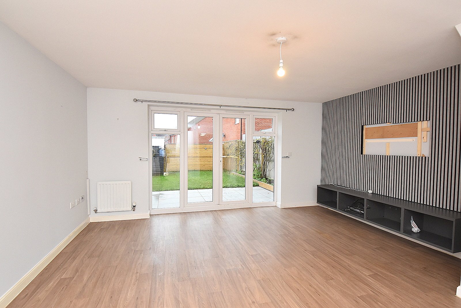 LIVING/DINING ROOM: 16’6” x 15’3” (max) A delightful open plan room with double glazed French doors leading out to an attractive rear garden. Two radiators, feature media wall ideal for a wall mounted TV, cupboard housing hot water tank, smooth plastered ceiling and opening to:
