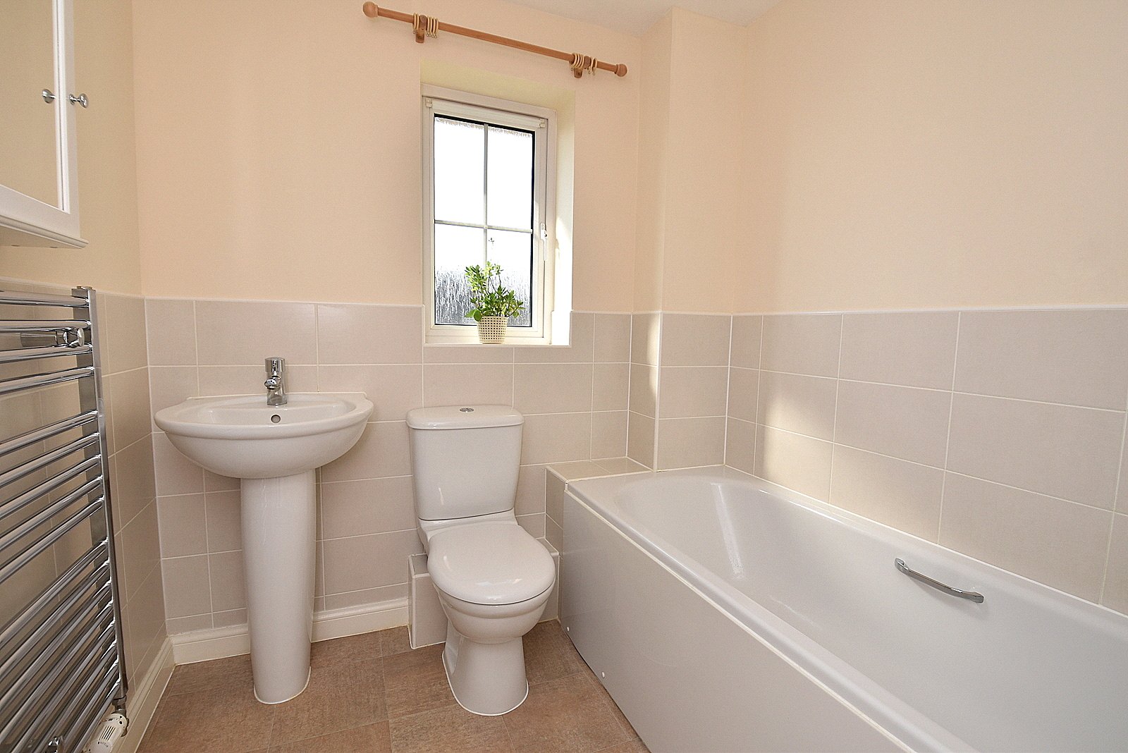 BATHROOM: Panelled bath with mixer tap and shower attachment, wash hand basin, close coupled WC, heated towel rail, double glazed window and smooth plastered ceiling with downlighter and extractor.