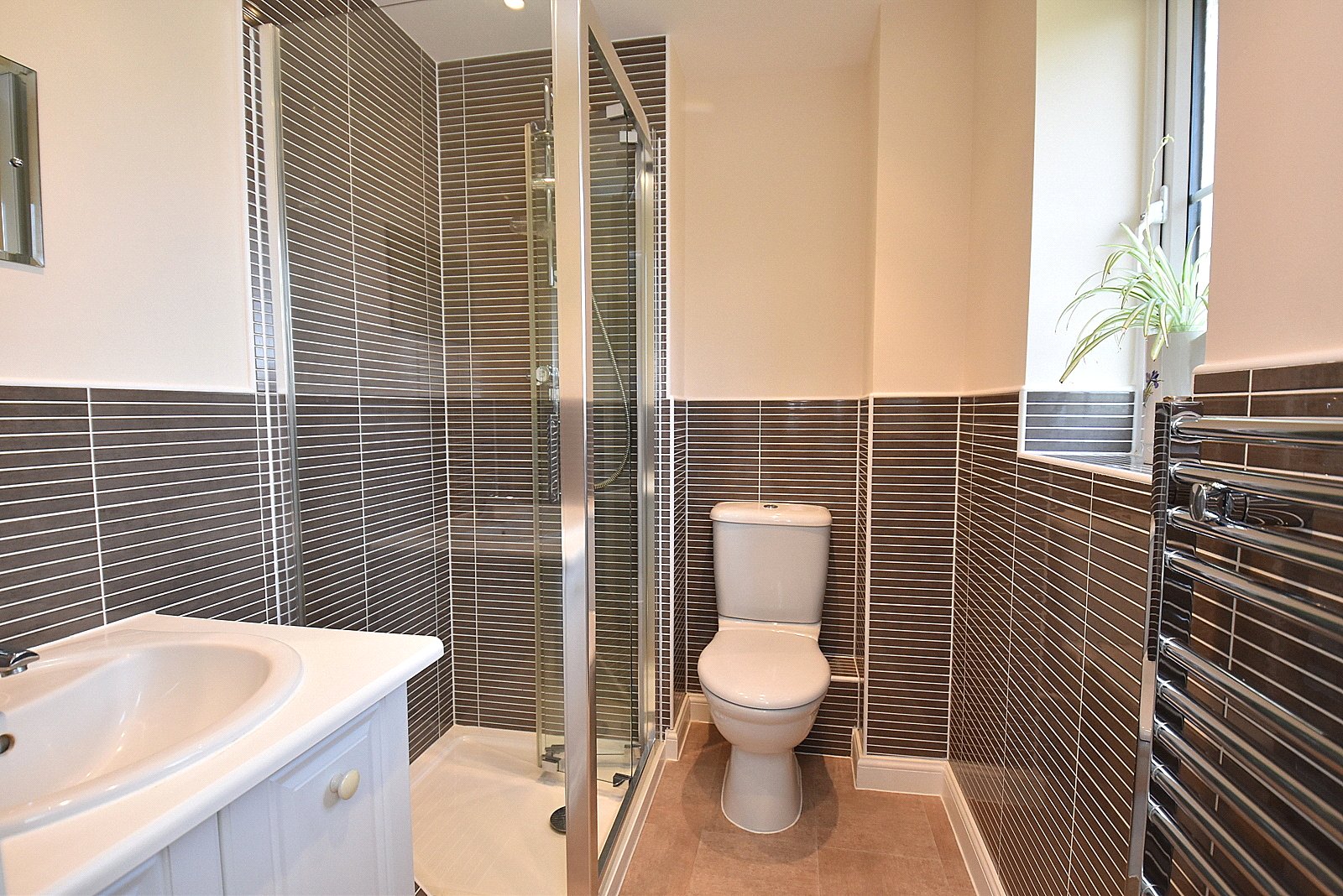 EN-SUITE SHOWER ROOM: A stylish suite comprising shower cubicle, close coupled WC, vanity wash basin unit, heated towel rail, tiled to splash prone areas, smooth plastered ceiling with downlighters and extractor, and double glazed window to front aspect.