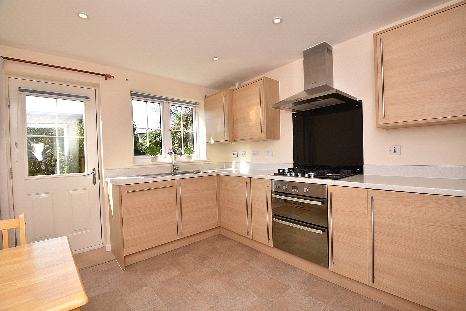 KITCHEN/BREAKFAST ROOM: 12’ x 9’9” Inset 1¼ bowl single drainer stainless steel sink unit with cupboard below, further range of soft close wall, drawer and base units with work top over, integrated dishwasher, washing machine and fridge freezer with defrosting fridge, water softener, built in oven with inset hob above, space for a kitchen table and chairs, smooth plastered ceiling with downlighters, double glazed window to rear aspect and door to garden.