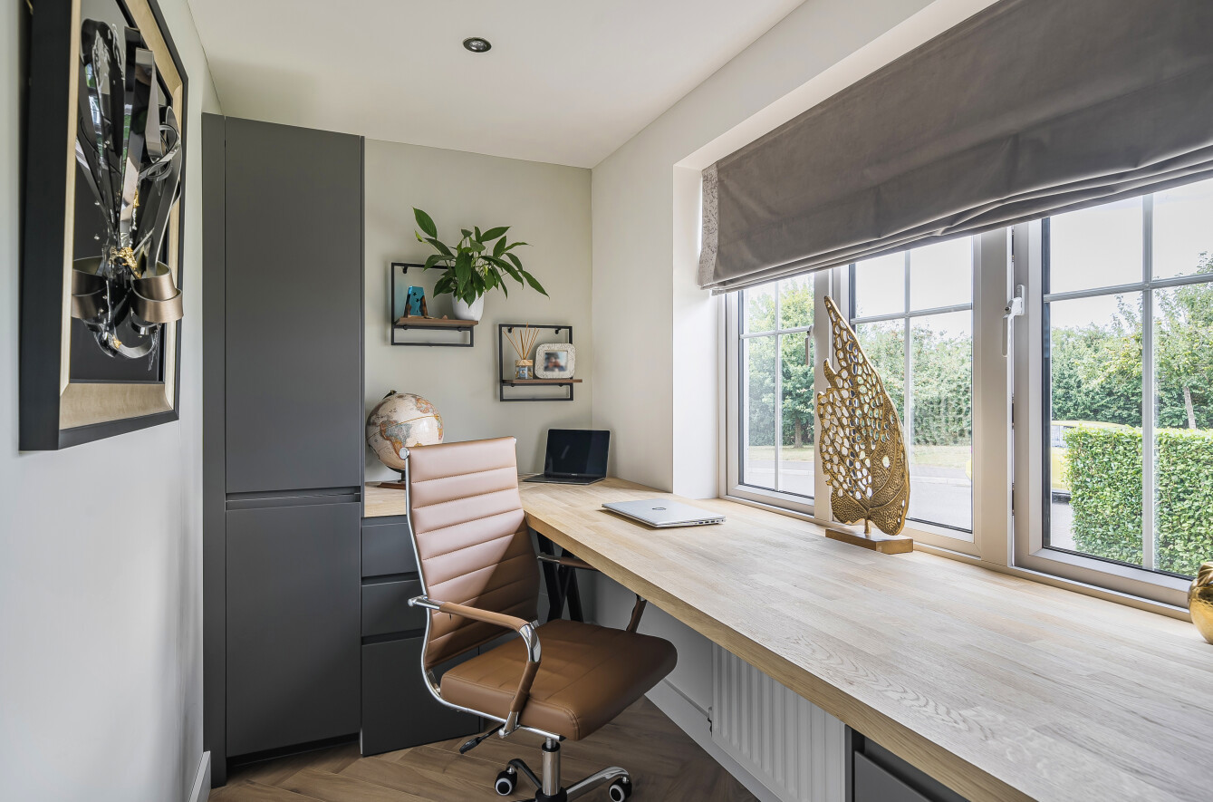 STUDY:12’7” x 5’2” Radiator, wood effect flooring, fitted office furniture with desk, double glazed window to front aspect and smooth plastered ceiling with downlighters.