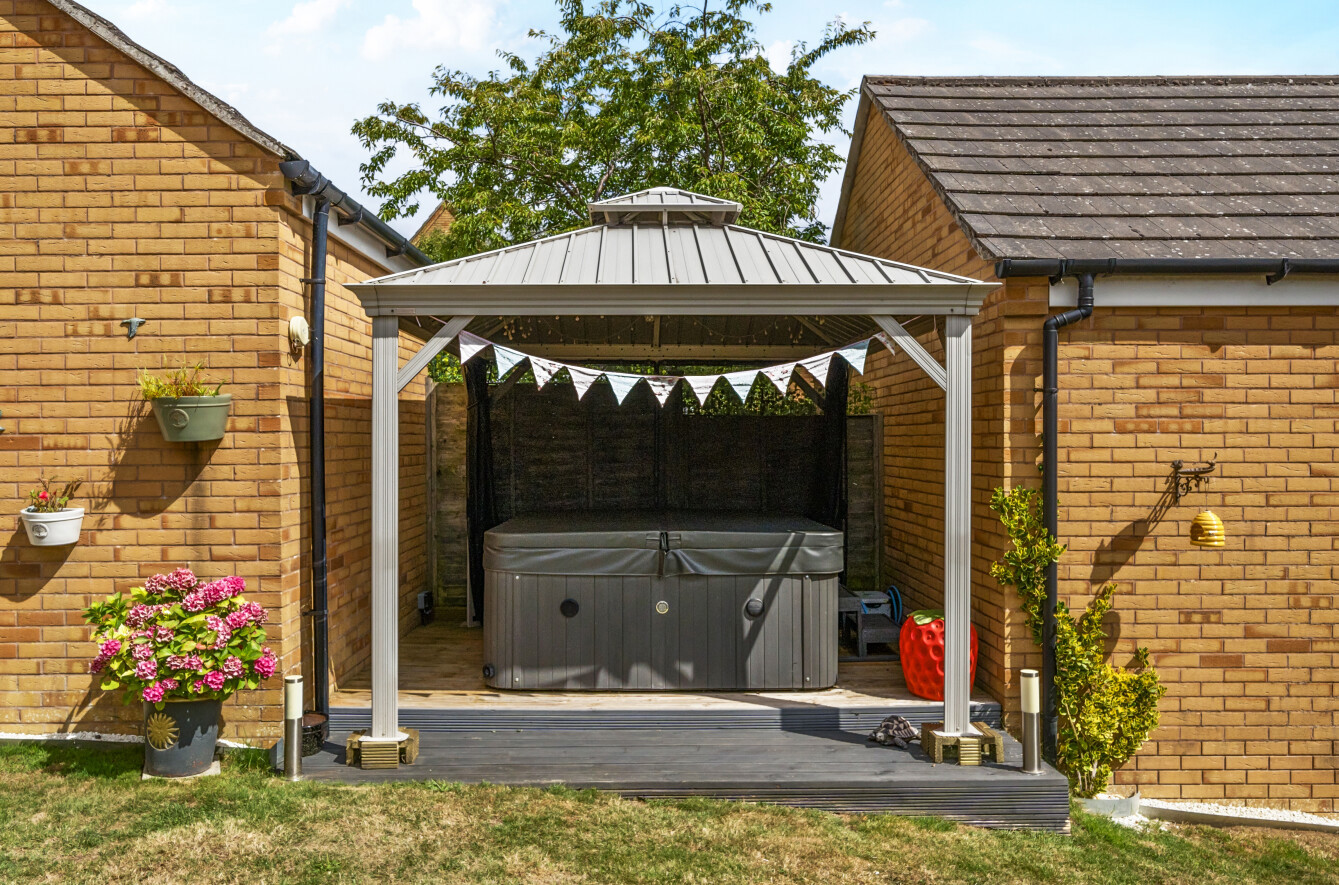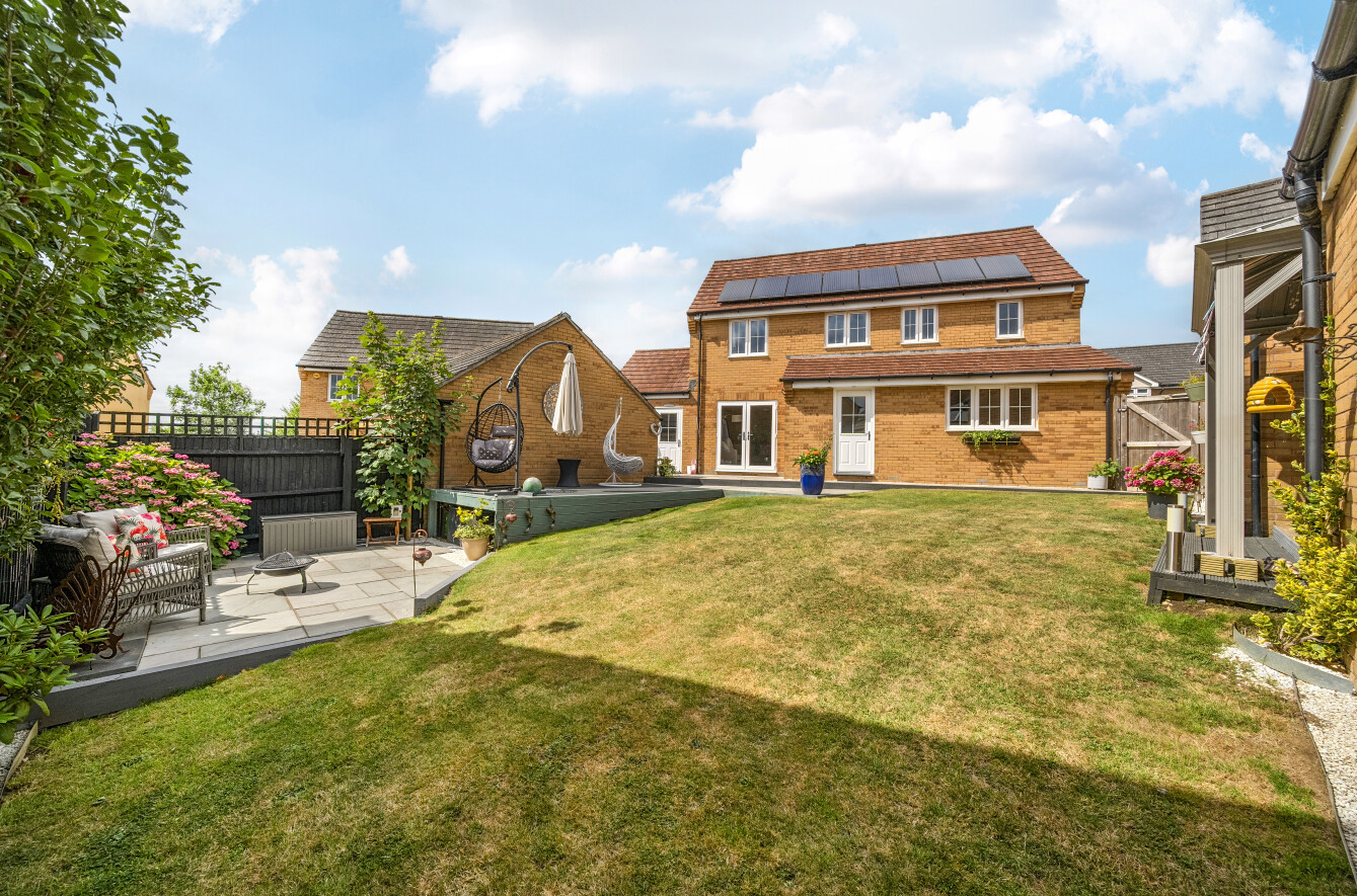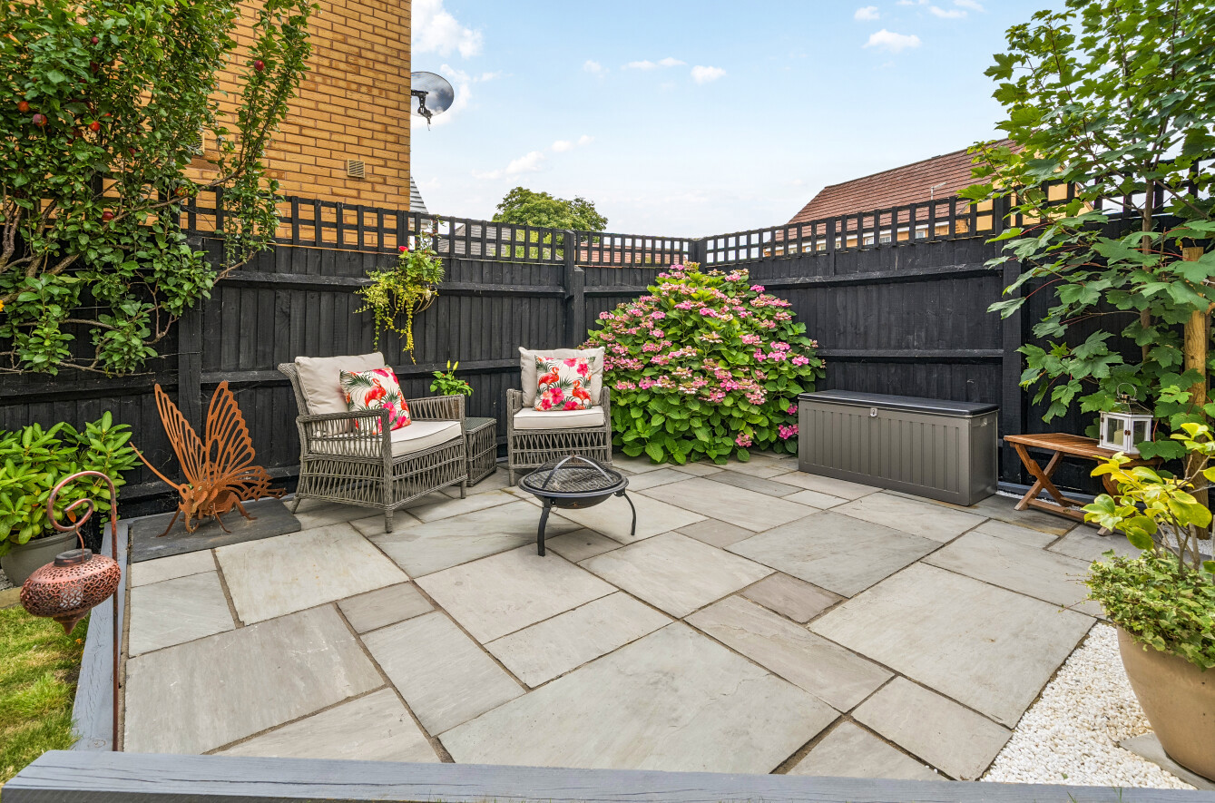 The landscaped garden is a standout feature, fully enclosed and tastefully designed to provide distinct zones for relaxation and entertainment. A paved patio adjoins the house, leading to a generous lawn. To the side of the garage, a raised decked terrace offers an inviting setting for alfresco dining, while a further decked area topped with a pergola is currently home to a hot tub. External lighting and a water tap add to the garden’s functionality.
