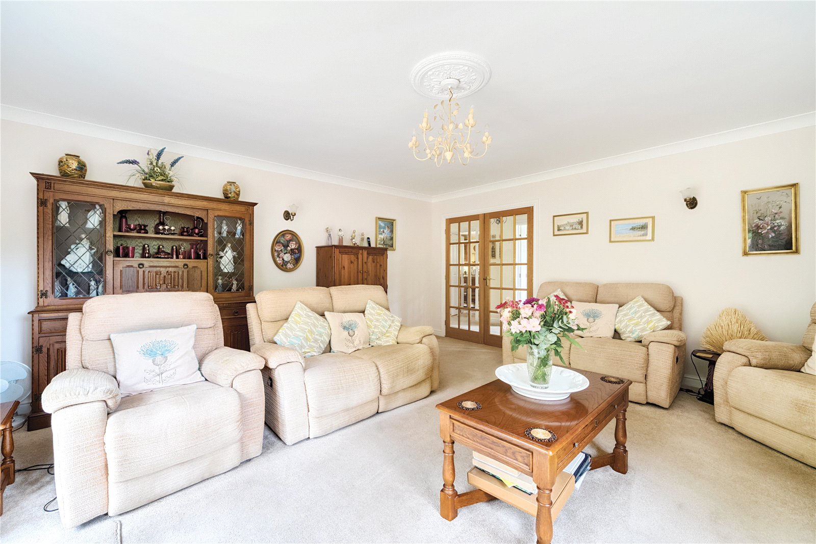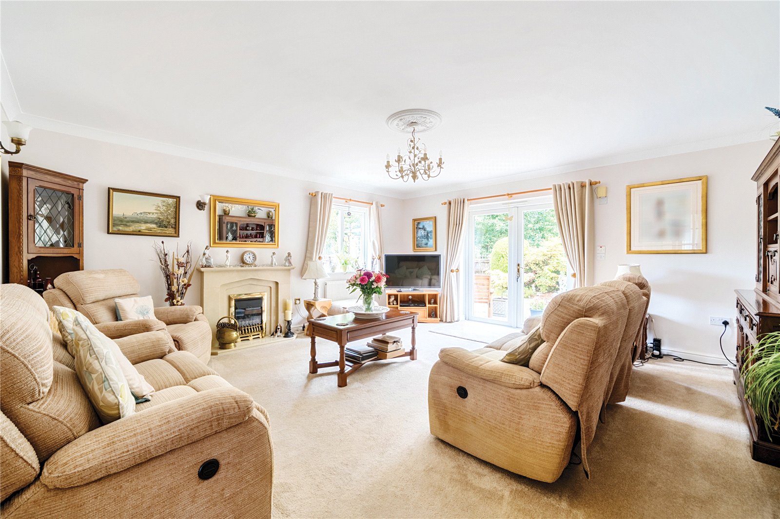 SITTING ROOM: 17’ x 16’4” A light and airy room with feature gas fireplace, double glazed French doors opening to the garden.