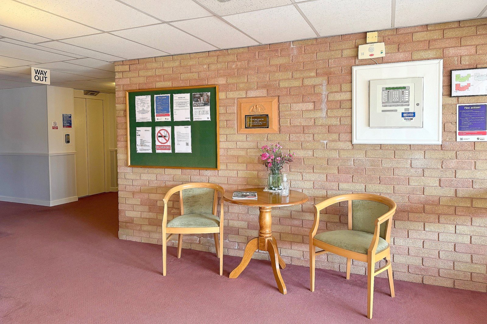 The main entrance has a security entry phone system for visitors and a remote key fob for the owner that opens the double doors into the reception hallway. The managers office is to the left, and further along the hallway double doors open to the communal lounge. There are stairs or lift to the first floor.