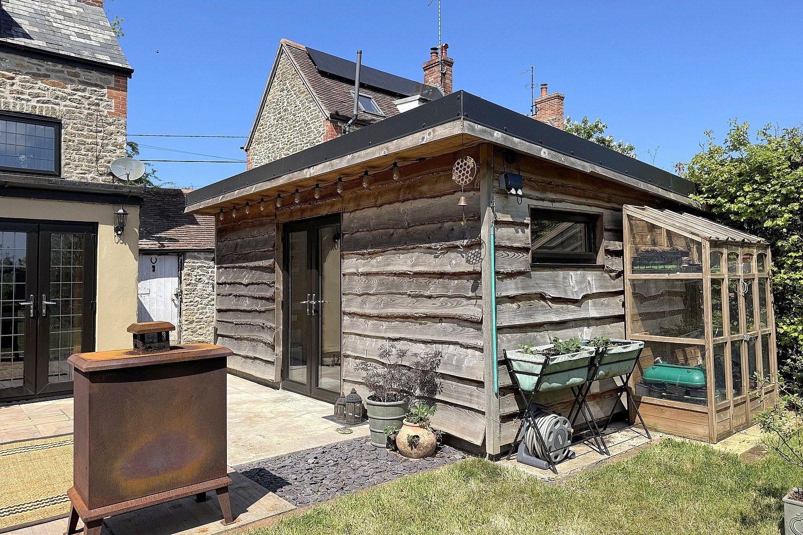The living accommodation is spread over three floors with the front door opening to a large light and airy kitchen with French doors opening to a paved patio perfect for al fresco dining and entertaining. The kitchen has plenty of space for an island or large table. A characterful sitting/dining room featuring an attractive fireplace.
