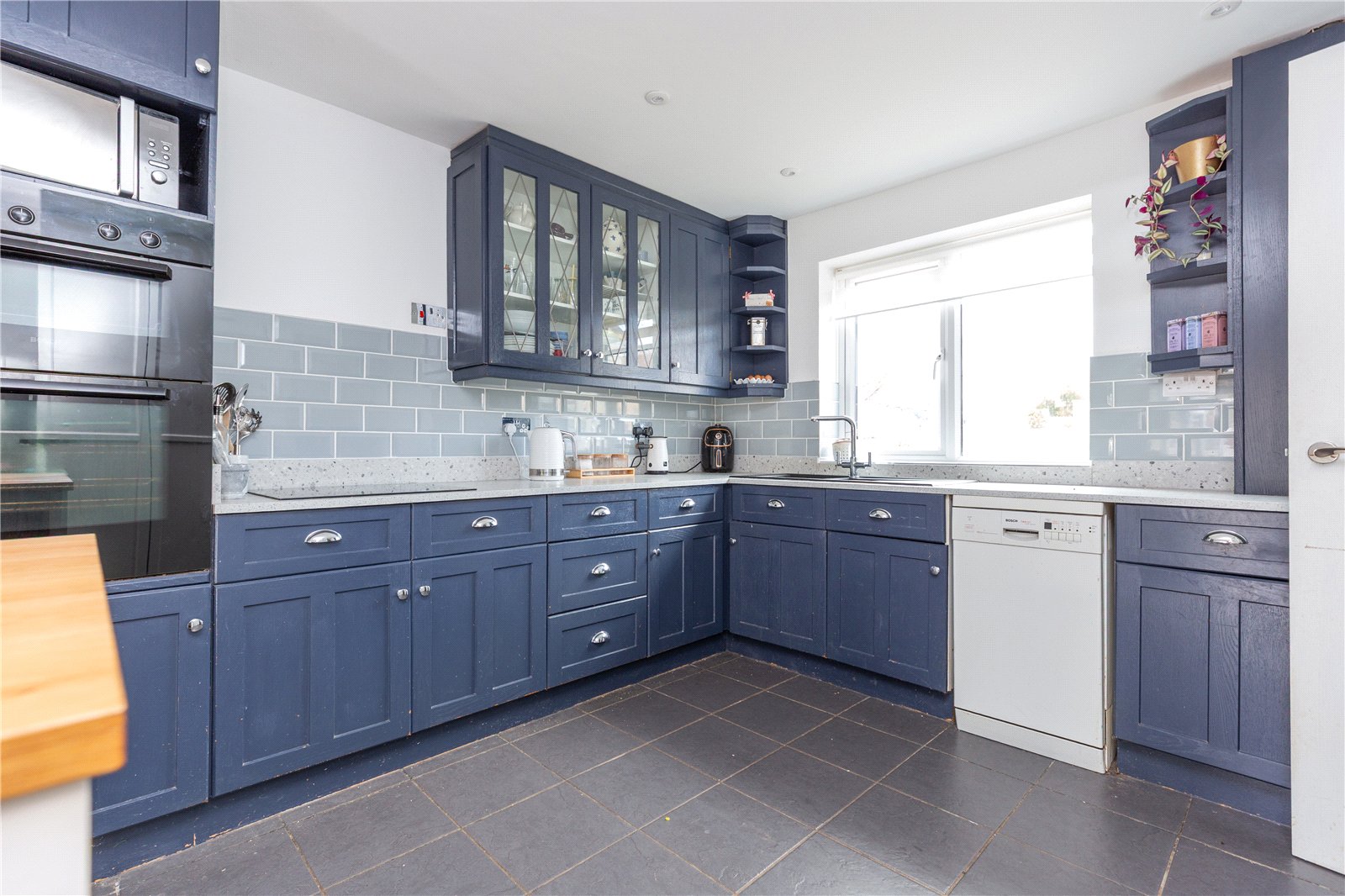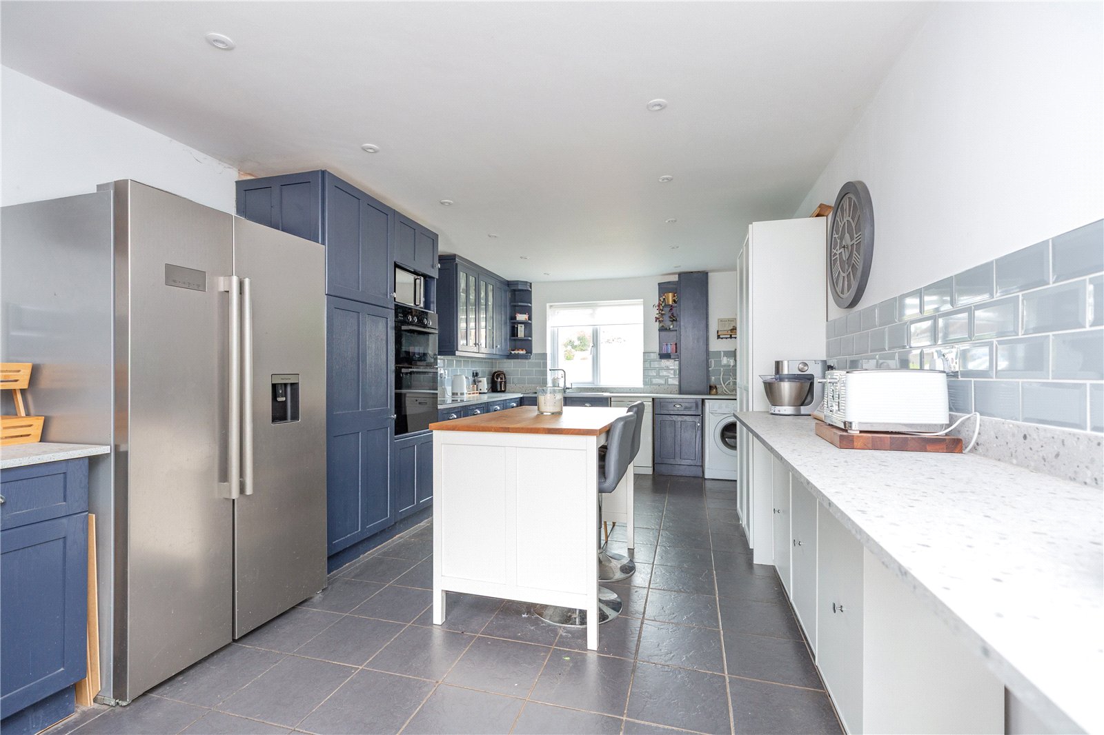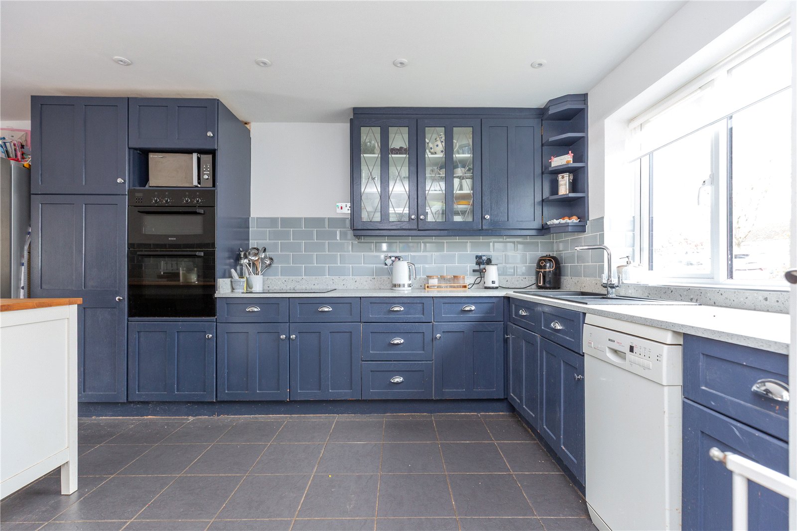 Fitted with an extensive range of floor and wall-mounted units with complementary rolled-edge work surfaces over. Inset one-and-a-half bowl sink and drainer, integrated double electric oven with four-ring halogen hob adjacent. Space and plumbing for a slimline dishwasher and washing machine, and space for an American-style fridge/freezer. Double-glazed windows to the front aspect, tiled flooring, and double opening doors providing access to: