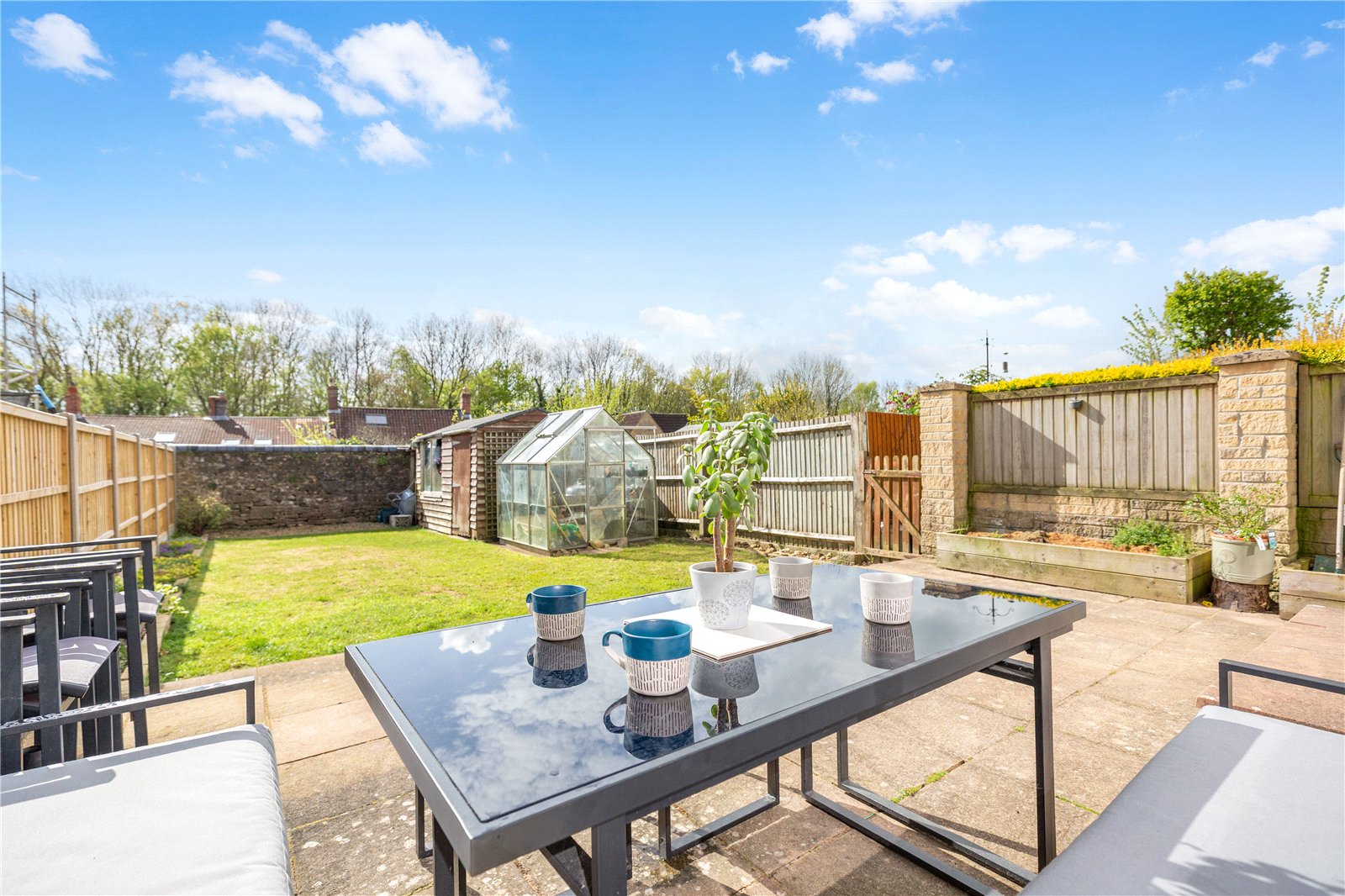 A great-sized paved seating terrace immediately to the rear of the property, with steps leading down to an enclosed landscaped garden comprising a lawn and gravelled area, along with a large timber shed and greenhouse.