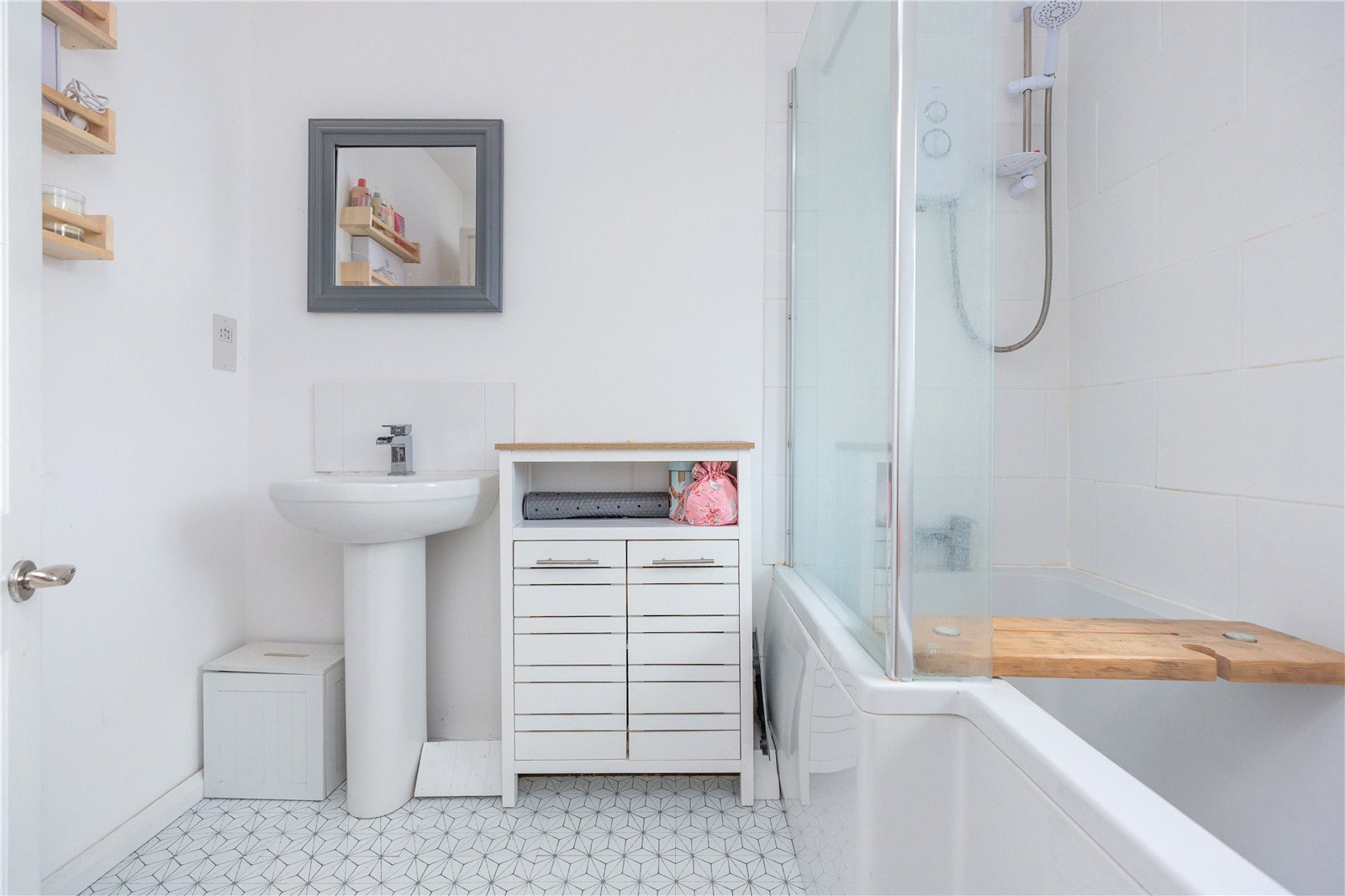 Featuring a white suite comprising a panelled bath with electric shower and glass screen over, pedestal wash hand basin, chrome heated towel rail, and tile-effect vinyl flooring. Double obscure-glazed window to the front aspect.