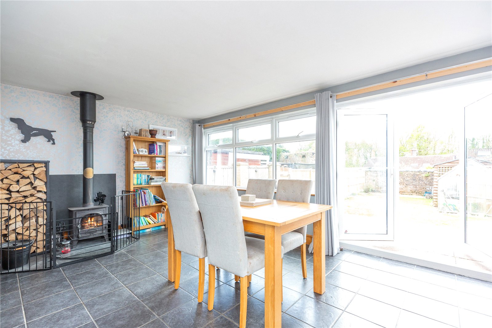 Double-glazed windows to the rear aspect with patio doors providing access to the rear terrace. Tiled flooring, a fitted wood-burning stove set on a slate hearth, TV point, and a large opening through to: