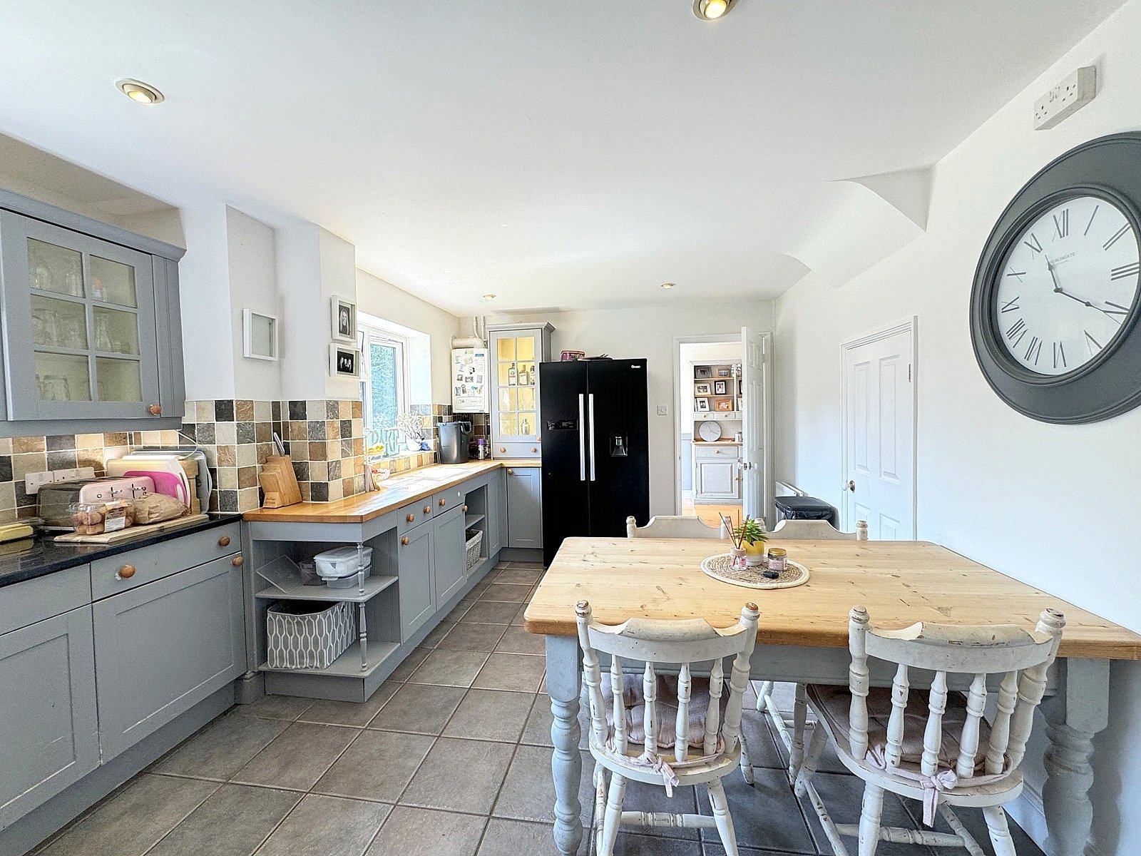 KITCHEN/BREAKFAST ROOM: 18’10” x 12’ (narrowing to 10’) A stylish shaker style kitchen comprising double bowl ceramic sink with cupboard below, further range of matching wall and base units with a drawer line, solid wood and granite work surface, display cabinet, space for a range style cooker, tiled floor, understairs cupboard, two double glazed windows overlooking the rear garden, smooth plastered ceiling with downlighters and door to: