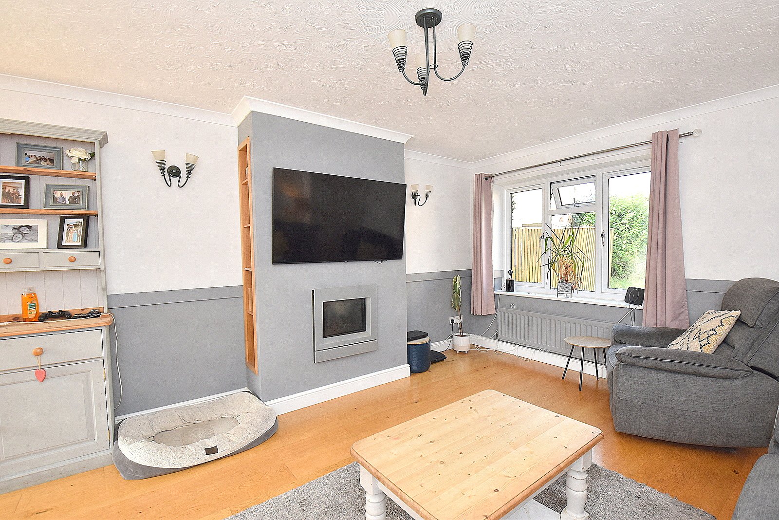 There is generous off road parking with a driveway leading to a detached garage (18’7” x 8’7”) with up and over door and light and power. A side path leads through to rear garden. A paved patio extended to a good size area of lawn enclosed by timber fencing. This is a wonderful garden for entertaining friends and family and includes a timber outbuilding with fitted bar.