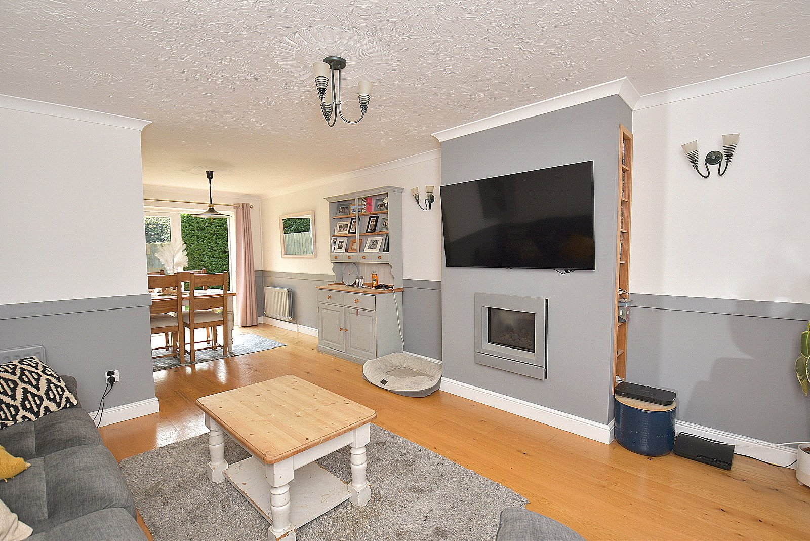 LIVING/DINING ROOM: 24’3” x 12’10” (narrowing to 7’11”) Feature fireplace with inset gas fire and display shelving, three radiators, coved ceiling, two wall light points, wood flooring, double glazed window to front aspect, double glazed French door to rear garden and door to: