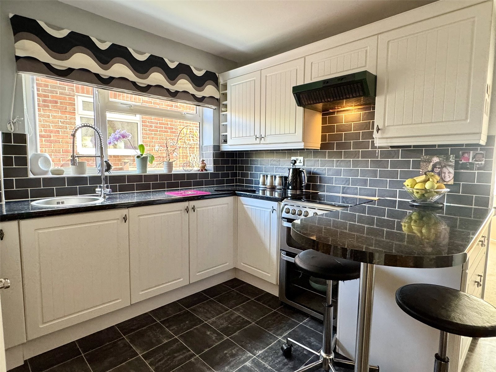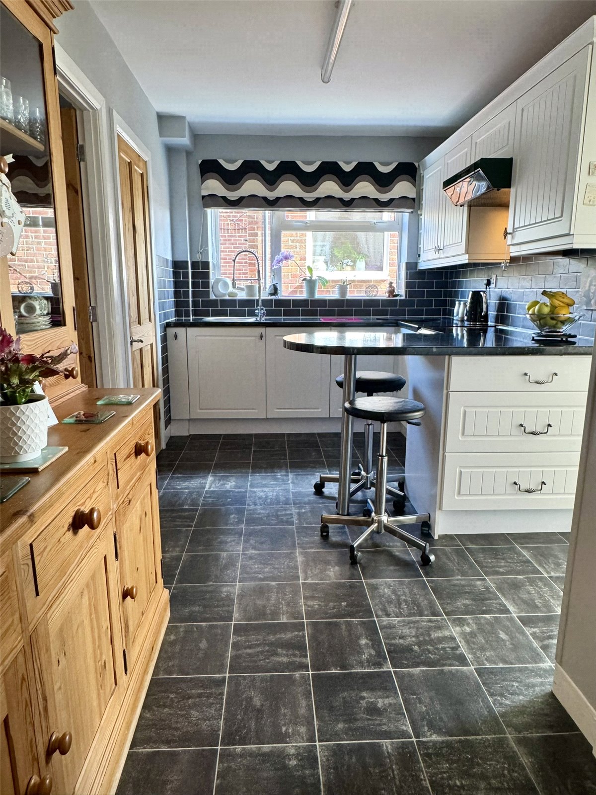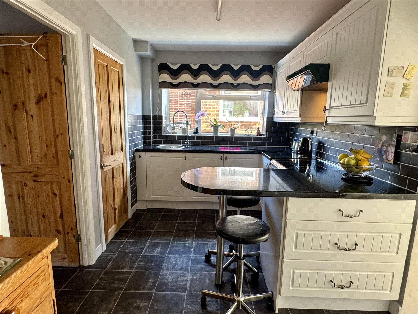 Kitchen 14'4" 7'9" (4.37m 2.36m). Side aspect uPVC double glazed window, fitted with a range of base and wall mounted white units with roll edge work top with breakfast bar and tile splash backs, stainless steel sink and mixer tap, space for cooker, door to pantry cupboard with window and shelving, door to understairs storage cupboard.