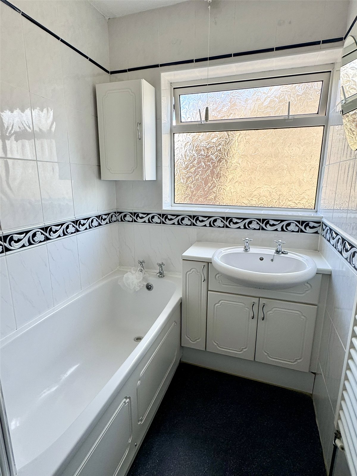 Bathroom Side aspect uPVC double glazed window with fitted white suite comprising of bath with shower over and vanity unity with wash hand basin inset. Fully tiled, heated towel rail.
