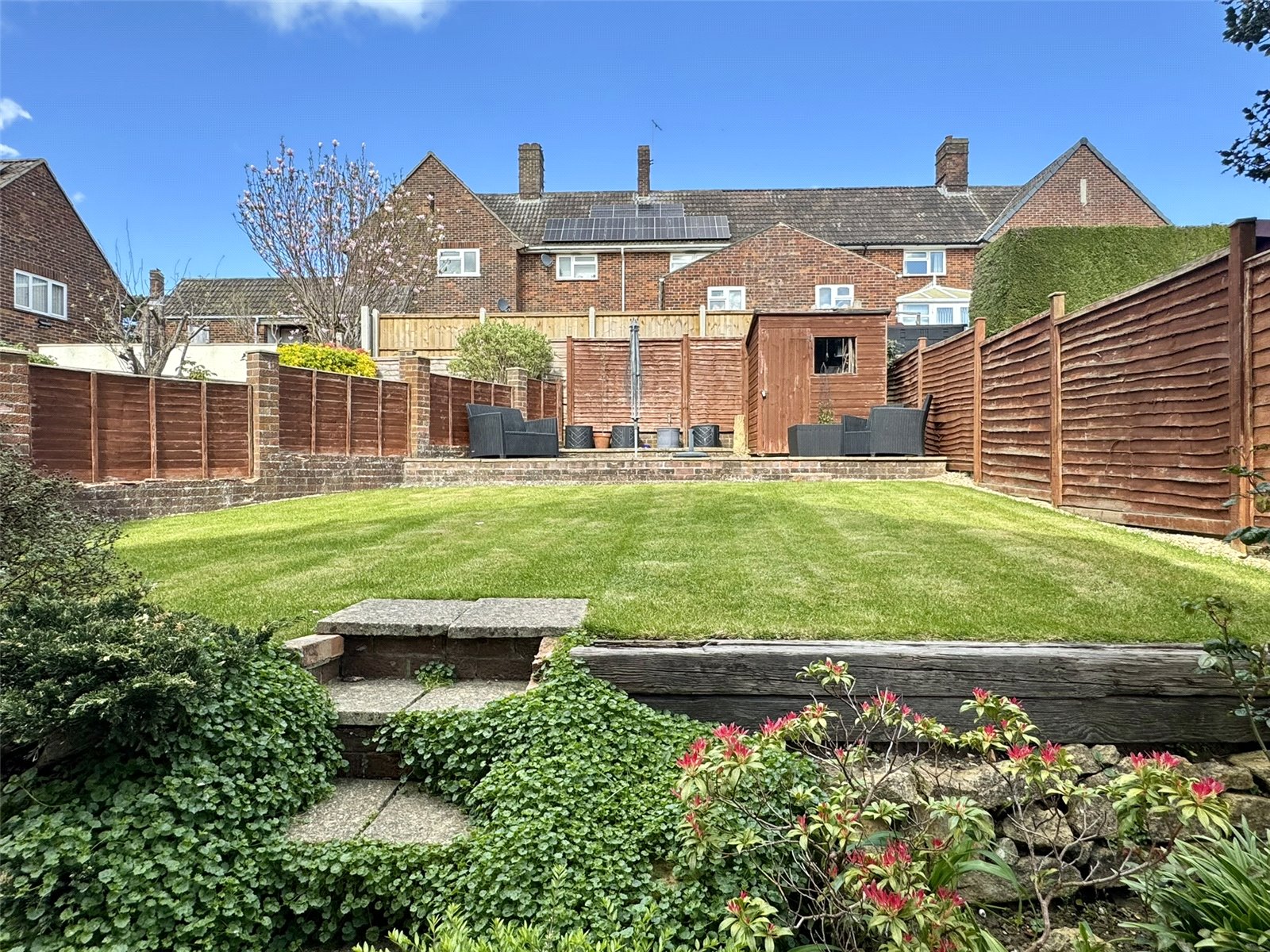 Landscaped rear garden is a true highlight. A covered patio seating area with power offers an ideal spot for entertaining in all weather, with steps leading to a lawned area, an elevated patio, and well-stocked flower beds. A timber garden shed provides useful storage, while the layout offers both secluded and open spaces for relaxation and play.