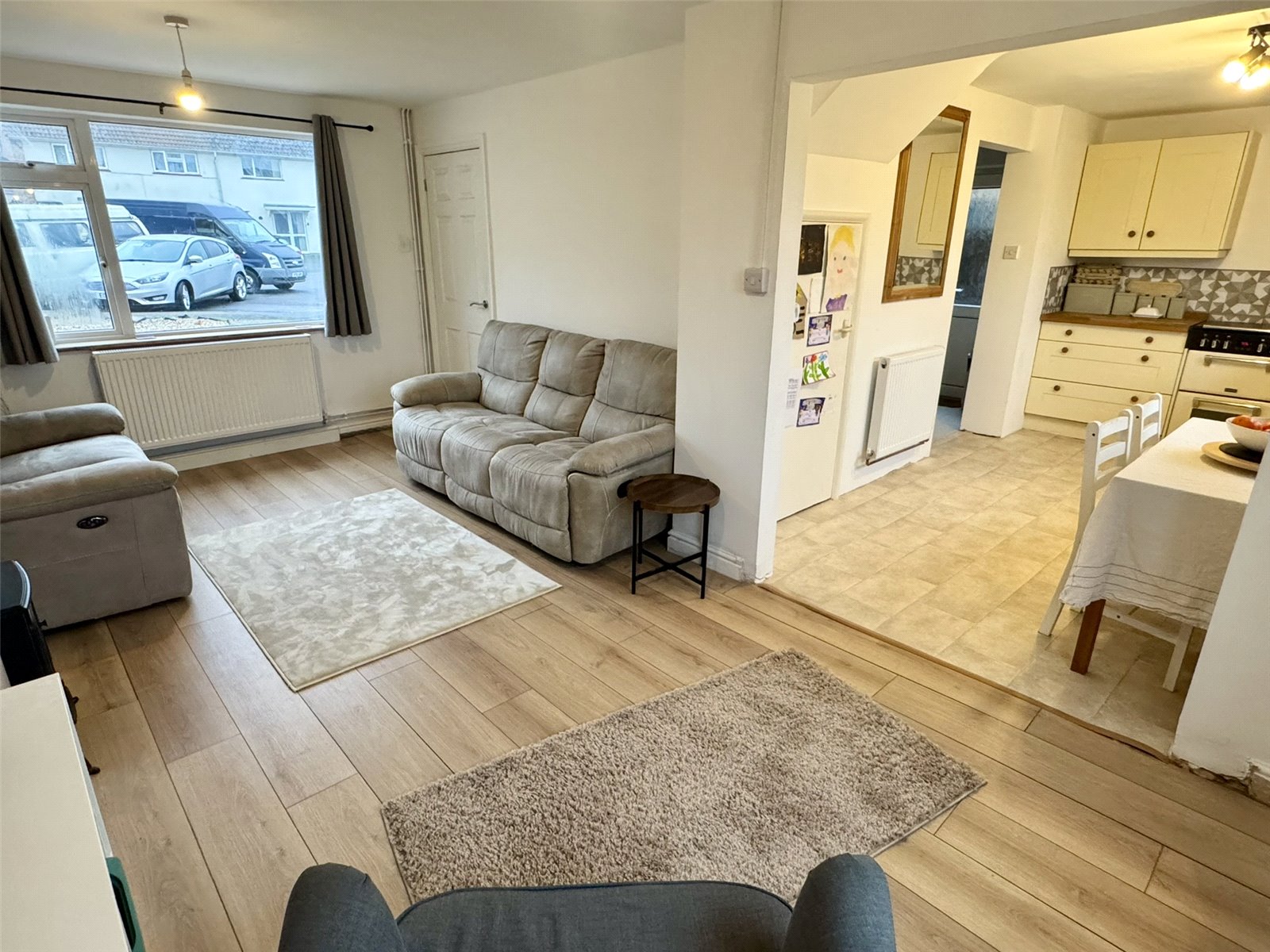 Lounge 17'11" (5.47m) x 10'2" (3.09m) narrowing to 9'1" (2.76m). Dual aspect double glazed windows to the front and rear. Television point, telephone point, radiator. Opening through to kitchen.
