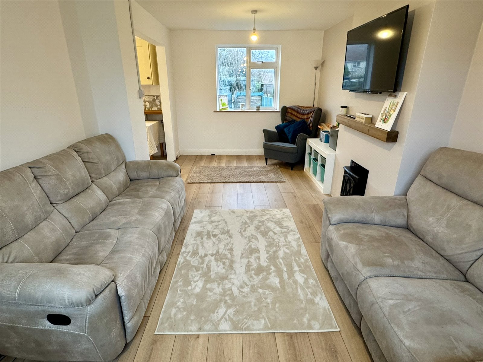 Kitchen 13'6" x 7'8" (4.11m x 2.34m). Fitted with wall and base units set beneath worktops with inset ceramic sink and drainer. Space for cooker. Radiator, understairs storage cupboard. Tiled splashbacks. Double glazed window to the rear aspect. Opening through to rear hall. Opening through to lounge.