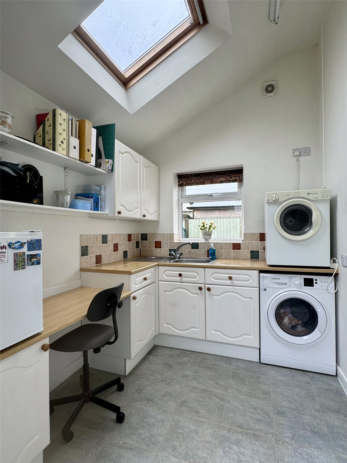 Utility Room 8'1" x 7'2" (2.46m x 2.18m). Fitted with wall and base units set beneath worktops with inset sink and drainer. Space and plumbing for washing machine. Skylight, double glazed window to the side aspect and uPVC door out to rear garden. Extractor.