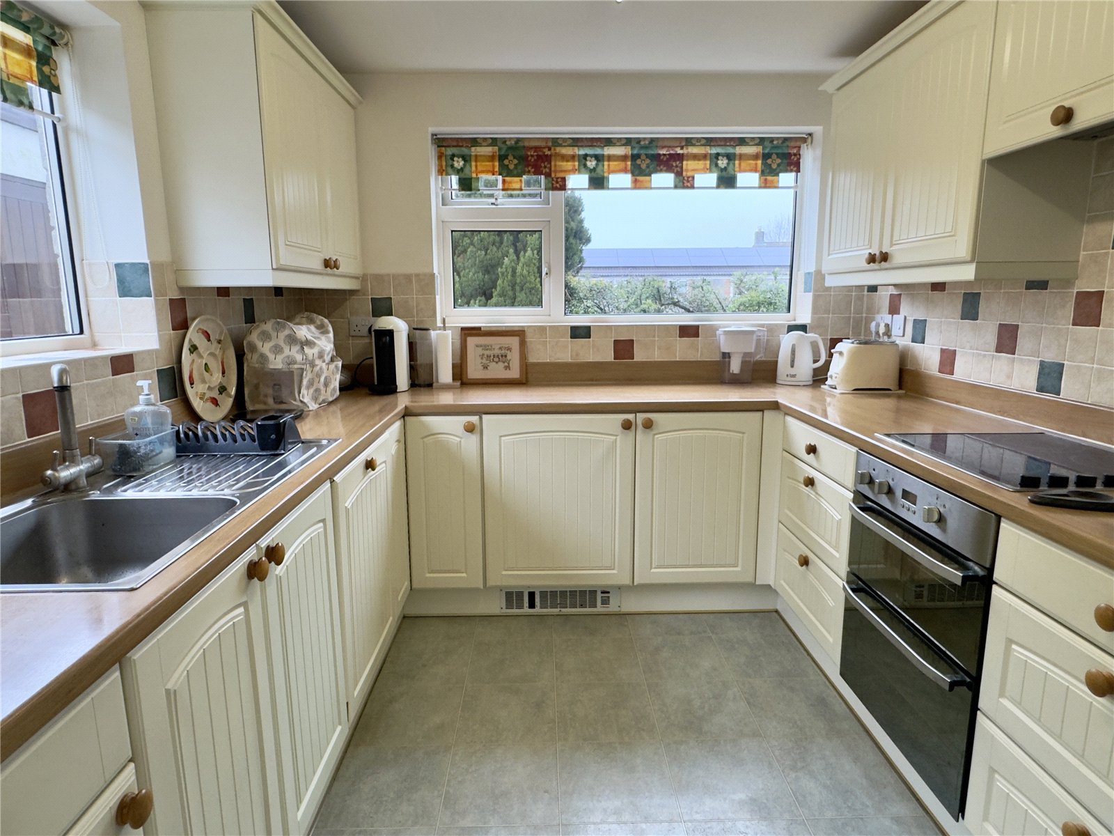 Kitchen 10'4" x 8'7" (3.15m x 2.62m). Fitted with a selection of wall and base units set eneath worktops with inset sink and drainer. Integrated dishwasher, integrated oven and grill with electric hob and hood over. Space for fridge freezer. Dual aspect room with windows to the front and side.
