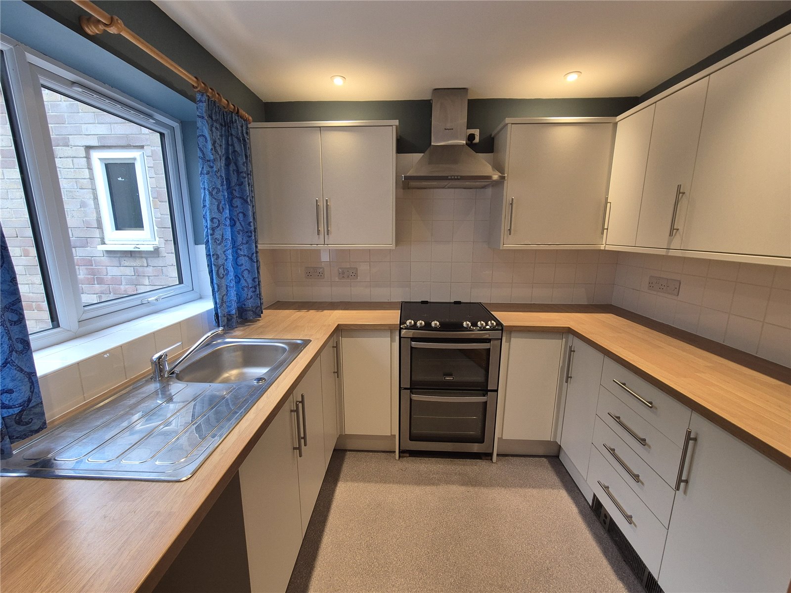 Kitchen 8'7" x 8'5" (2.62m x 2.57m). Fitted with a range of matching wall and base units with adjoining work top preparation surface with inset stainless steel sink and drainer with mixer tap over complemented by tiled splash backs. Appliance spaces for washing machine and fridge/freezer. Cooker with cooker hood over, inset spotlights and uPVC double glazed window to the front aspect.