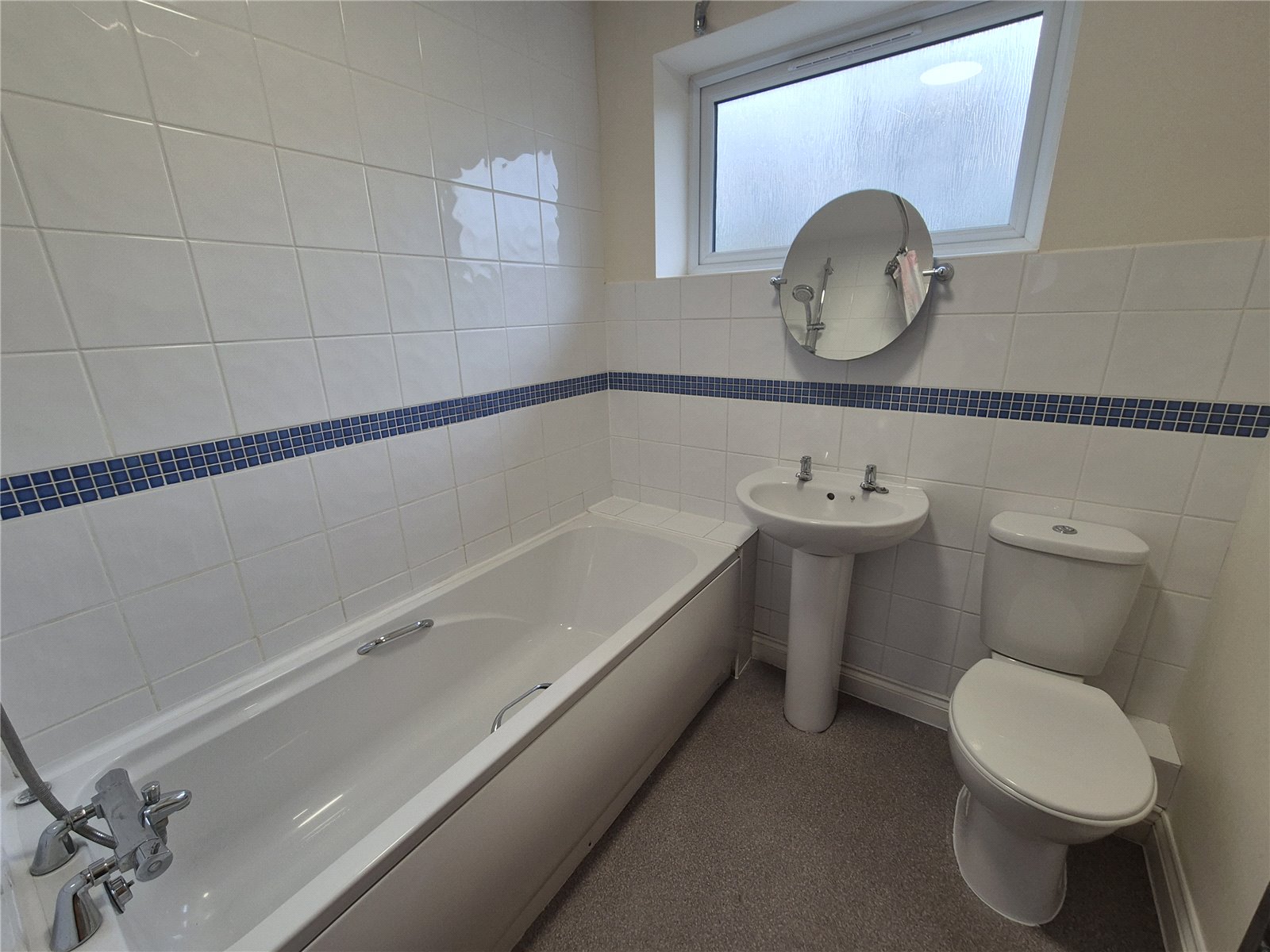 Bathroom Benefiting a three piece suite comprising of a panelled bath, pedestal wash hand basin and low level W.C. Ceramic tiling, heated towel rail and uPVC double glazed window.