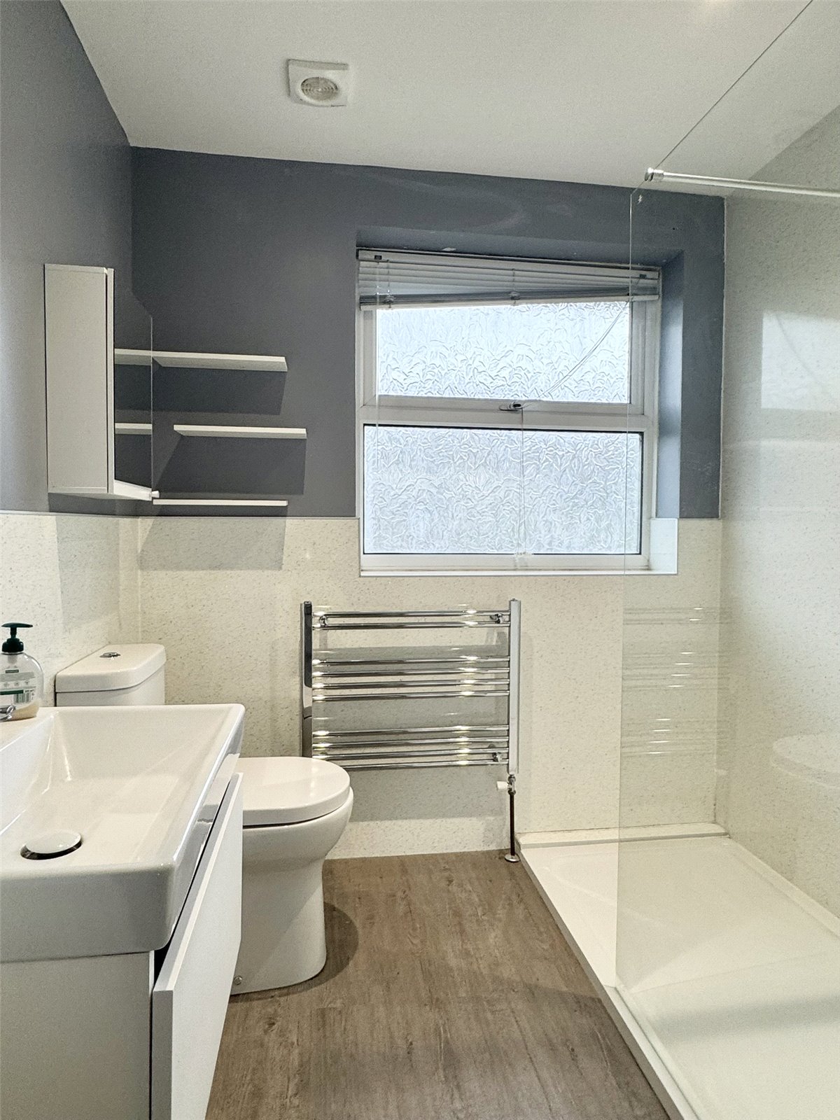 Shower Room Fitted with a three-piece modern suite comprising walk-in shower cubicle with mains shower, low-level W.C. and wall mounted wash hand basin with storage under. Modern panelled splashbacks, spotlights, heated towel rail, extractor and opaque double glazed window to the front aspect.