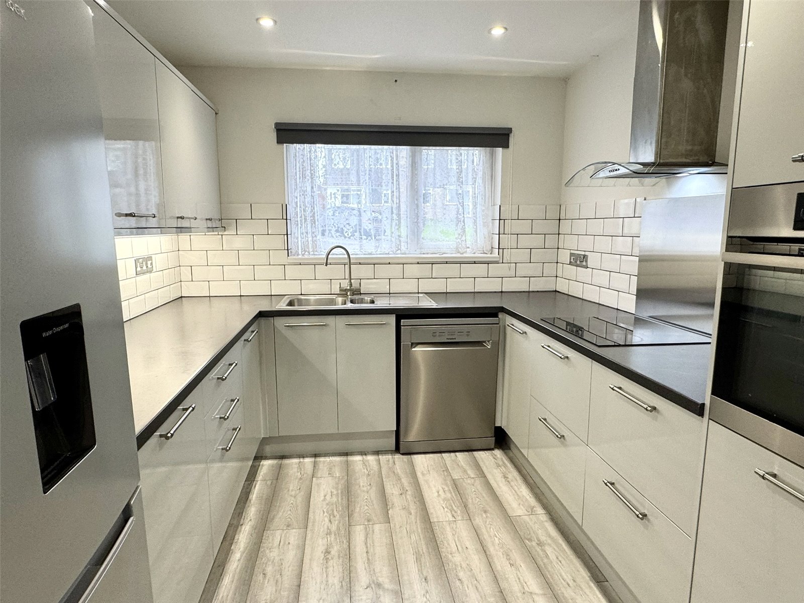 The modern kitchen features a range of sleek fitted units providing ample storage, complemented by an elevated inset oven, induction hob, and freestanding dishwasher and fridge freezer.