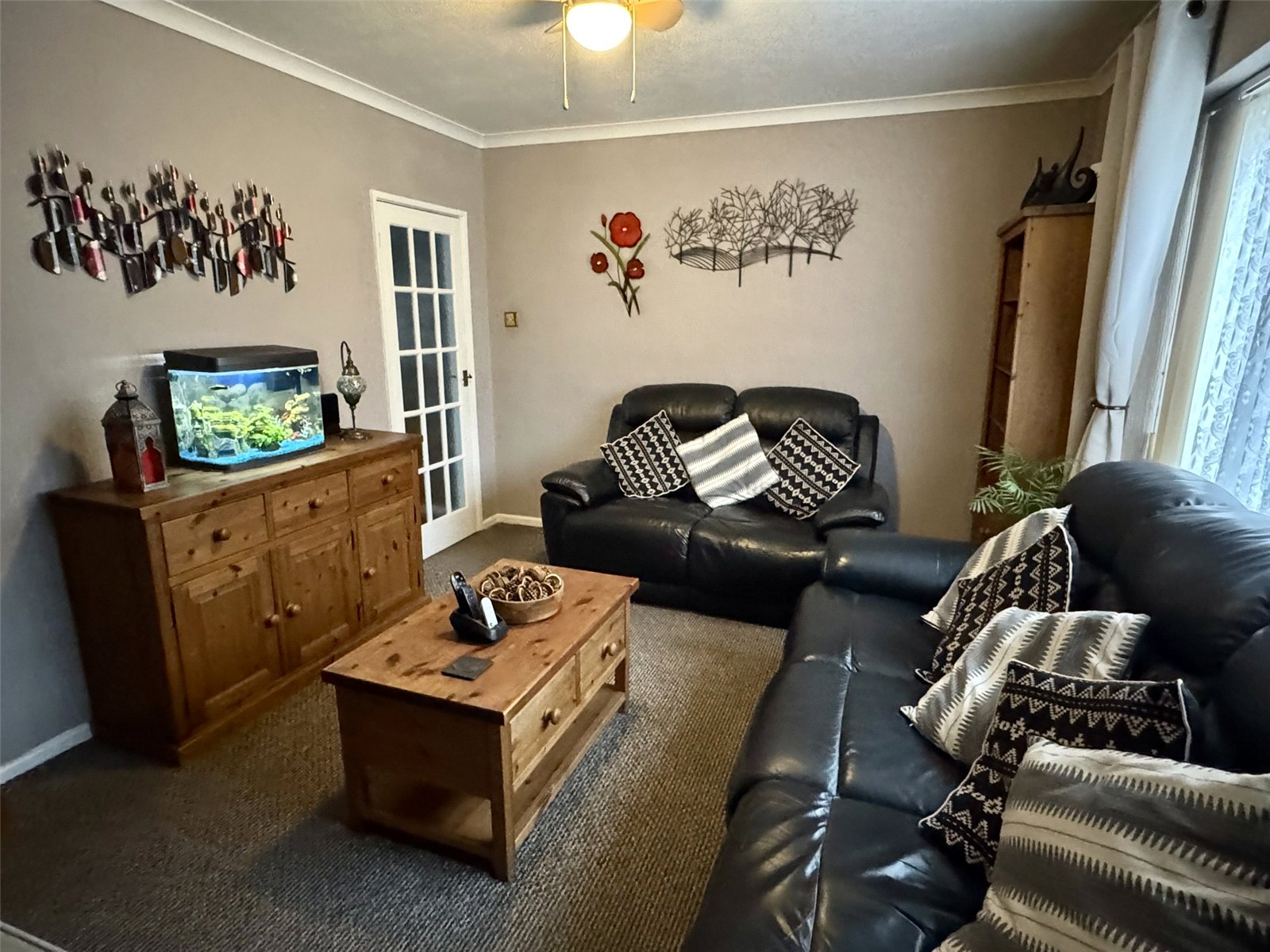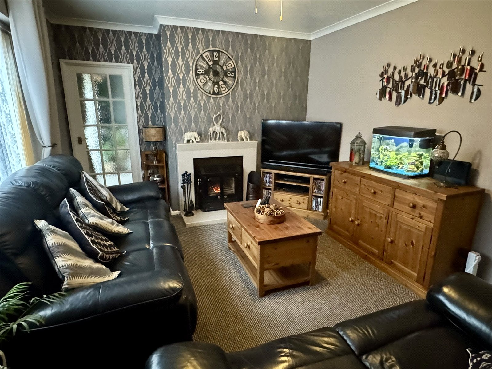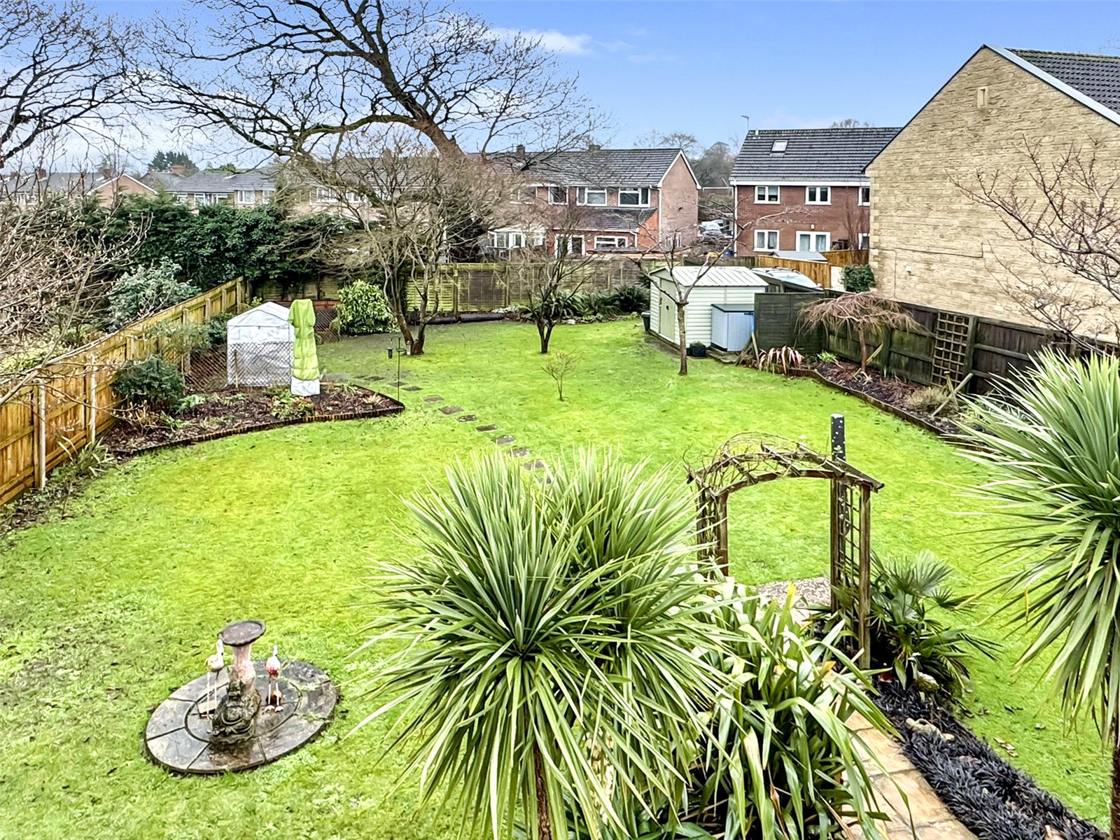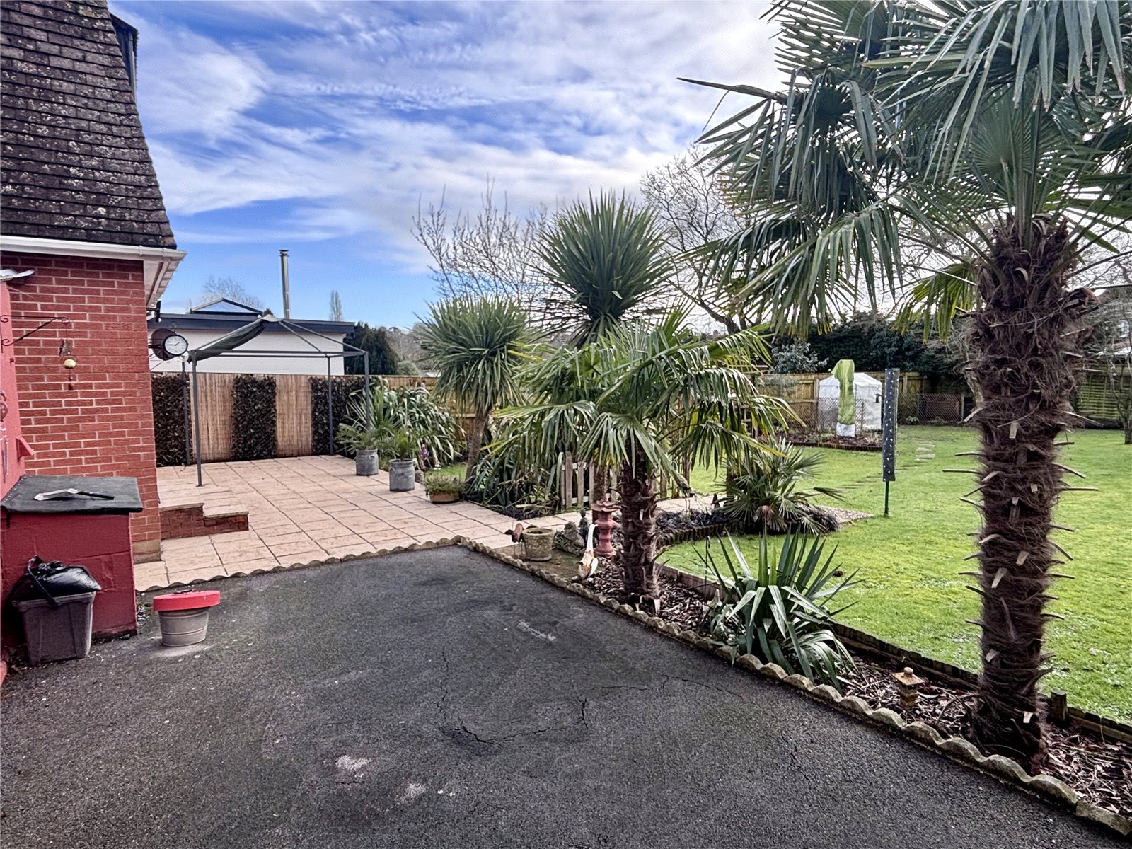 Rear The property enjoys a generously proportioned rear garden, predominantly laid to a large, level lawn and attractively enclosed by a mix of mature planting and established trees, providing both privacy and a pleasant outlook. A further patio seating area offers an ideal space for outdoor entertaining, while a gated tarmac driveway to the rear provides valuable additional off-road parking.