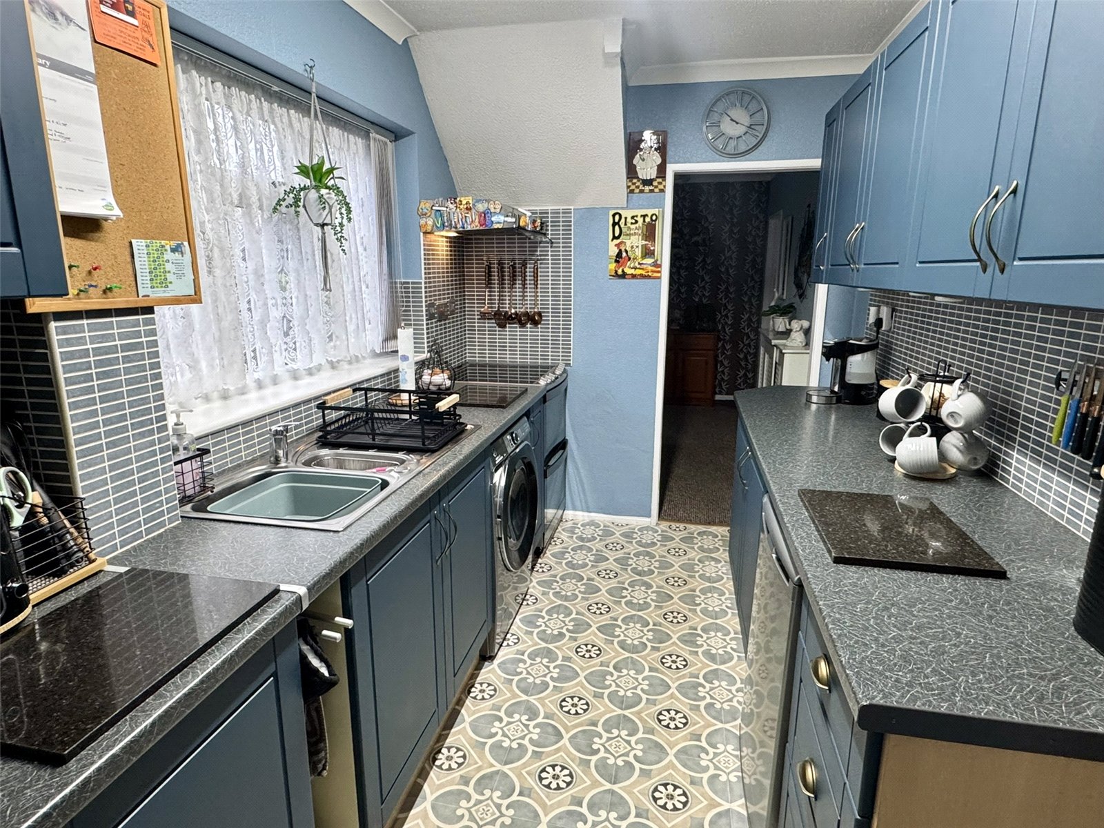 Kitchen 12' x 6'11" (3.66m x 2.1m). Fitted with a range of matching wall and base units set beneath worktops with inset one and a half bowl sink and drainer. Space for cooker with hood over, space and plumbing for washing machine, space for base fridge. Double glazed window to the front aspect. Openings through to dining room and entrance hall. Wooden glazed door out to side hallway.