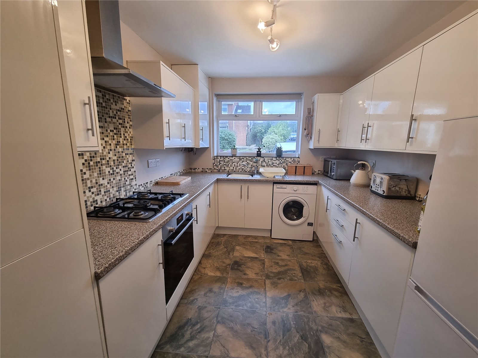 Kitchen 12'10" x 8'8" (3.9m x 2.64m). Fitted with a range of modern matching high gloss kitchen units with adjoining work top preparation surface and inset stainless steel sink and drainer with mixer tap over complemented by tiled splash backs. Fitted oven with five burner gas hob and cooker hood over. Appliance spaces for fridge/freezer and washing machine. Recently fitted wall mounted concealed gas central heating boiler, radiator and uPVC double glazed window to the front aspect.