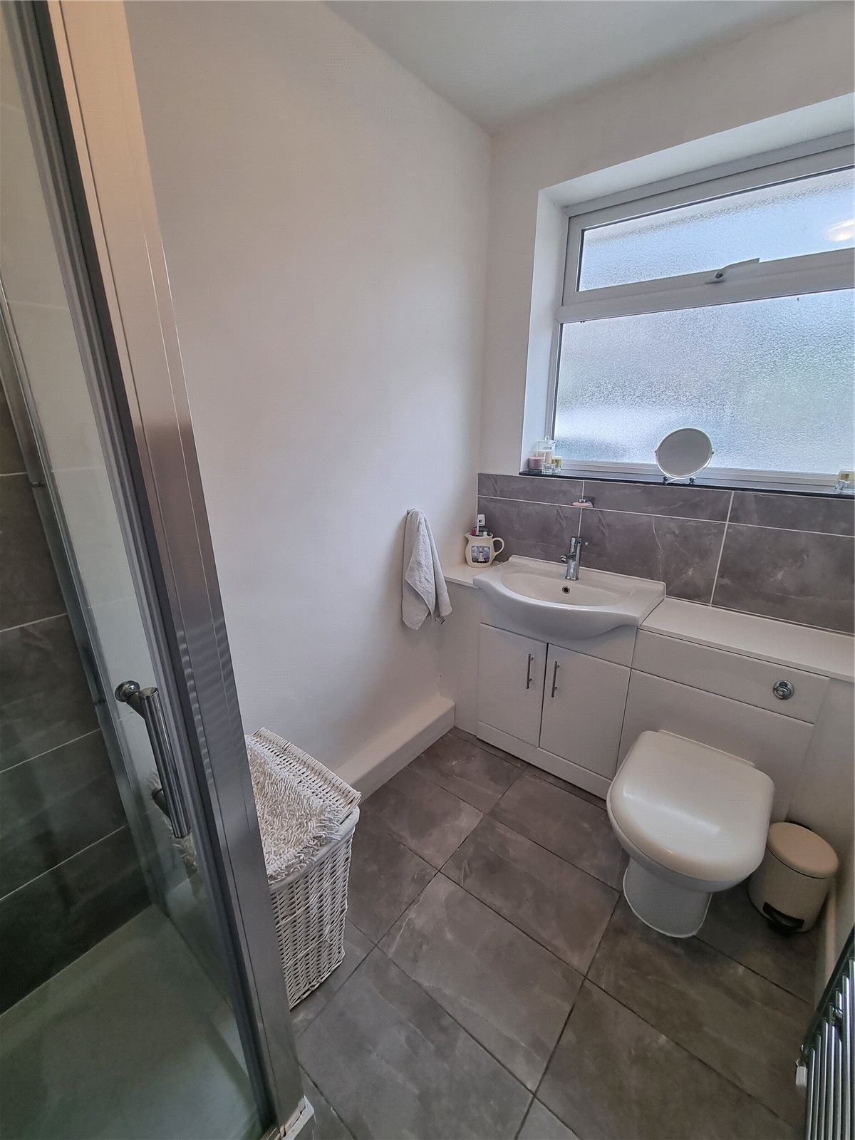 Shower Room Benefiting a three piece suite consisting of a shower cubicle, W.C and wash hand basin with storage units below. Ceramic tile splash backs and flooring. Heated towel rail and uPVC double glazed window.