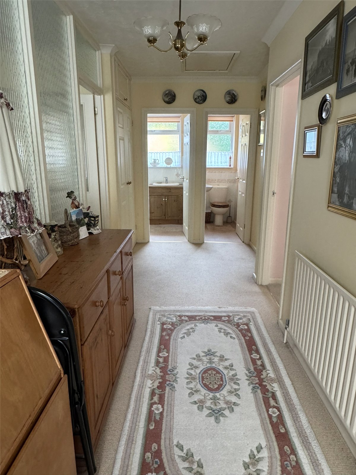 Entrance Hall Radiator and access to roof void. Built-in storage cupboard with coat hanging space and shelving. Built-in airing cupboard with wall mounted central heating boiler and slatted shelving.