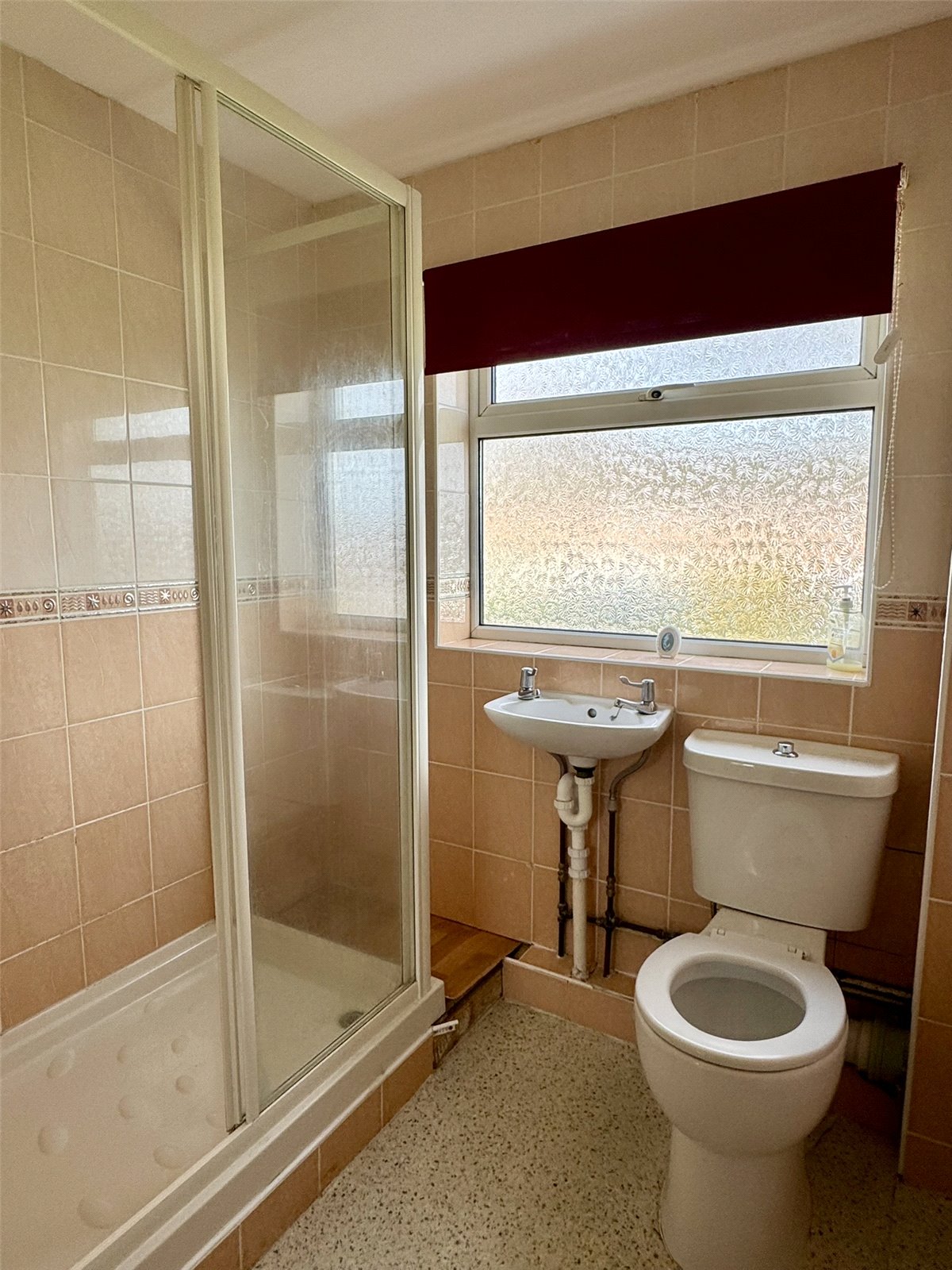 Bathroom Fitted with a three-piece suite comprising shower cubicle with electric shower, wall mounted wash hand basin and low-level W.C. Opaque double glazed window to the front aspect.