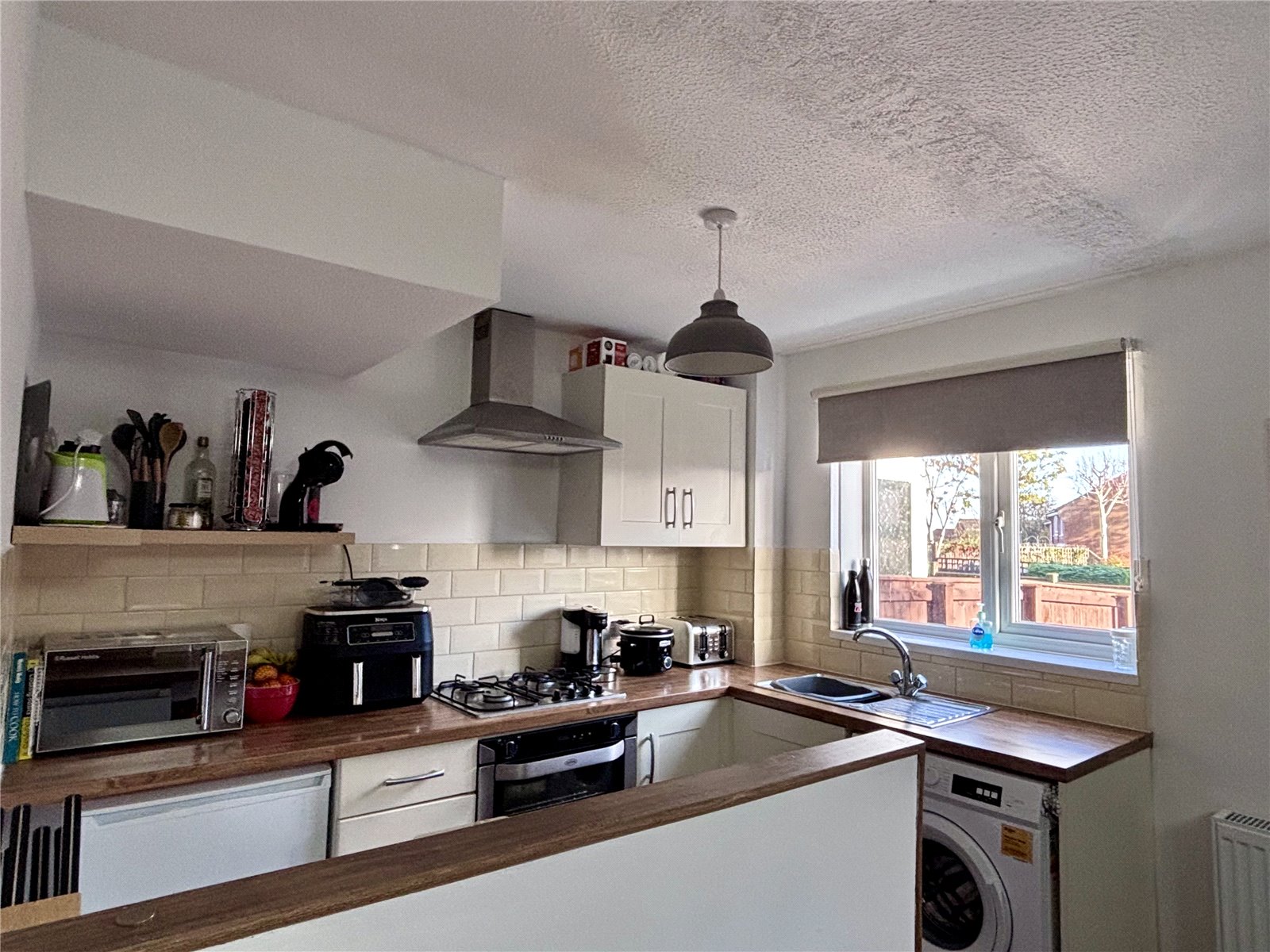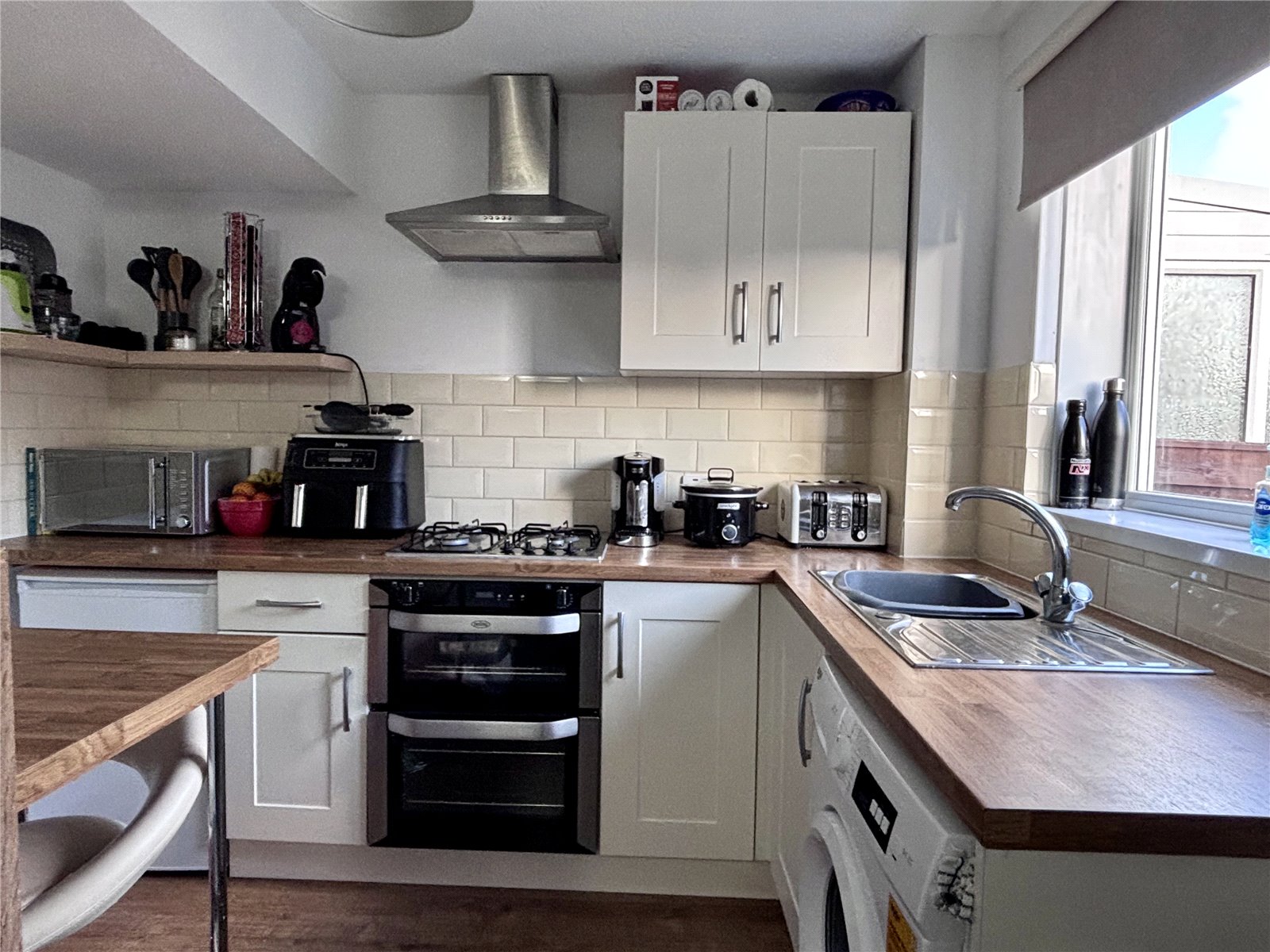 Kitchen Area Modern fitted kitchen with uPVC double glazed window overlooking the garden, a range of base and wall mounted units finished with a wood effect role edge work top with breakfast bar, inset stainless steel sink and drainer with mixer tap, fitted with a Belling cooker, gas hob and cooker hood over, space for under counter washing machine, fridge and freezer.