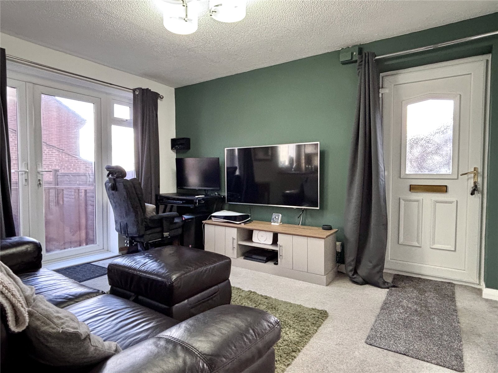 Living Room uPVC double glazed French doors opening to garden with window, two radiators and stairs rising to first floor.