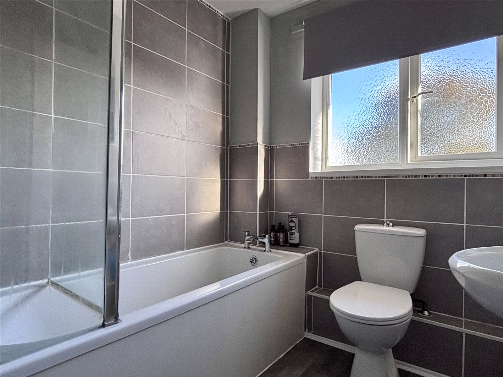Bathroom uPVC double glazed window, fully fitted white suite with tile splash backs comprising of bath with shower over, close couple W.C. pedestal wash hand basin, heated towel rail.