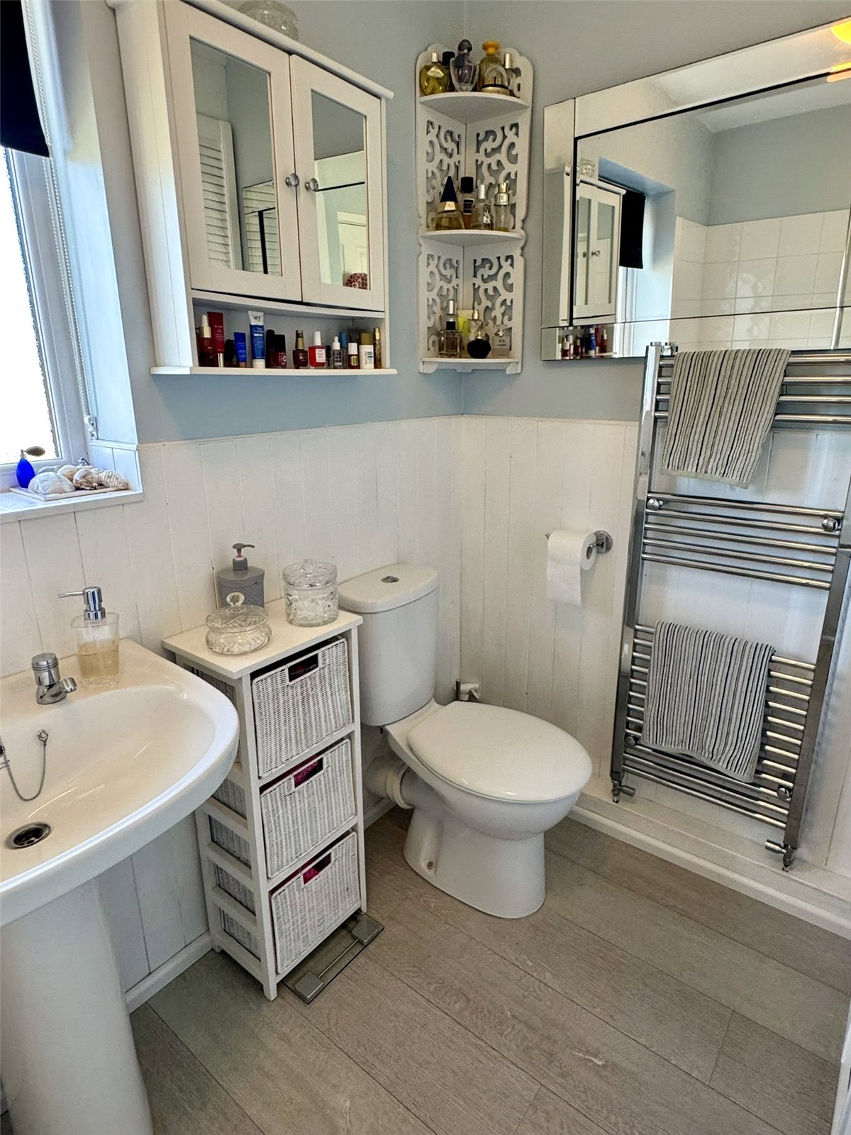 Bathroom Fitted with a three-piece white suite comprising panelled bath with shower attachment and screen over, low-level W.C and pedestal wash hand basin. Tiled splash backs, heated towel rail, fitted storage cupboard and opaque double glazed window to the rear aspect.