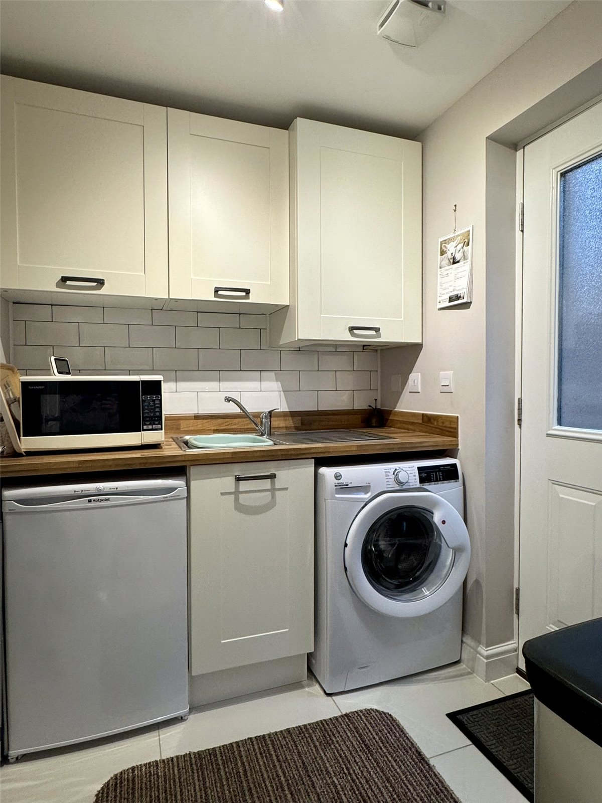 Utility Room 6'4" x 5'8" (1.93m x 1.73m). Fitted with base units set beneath wooden worktops with inset stainless steel sink and drainer. Space and plumbing for washing machine and tumble dryer, wall mounted central heating boiler and opaque glazed door out to driveway.