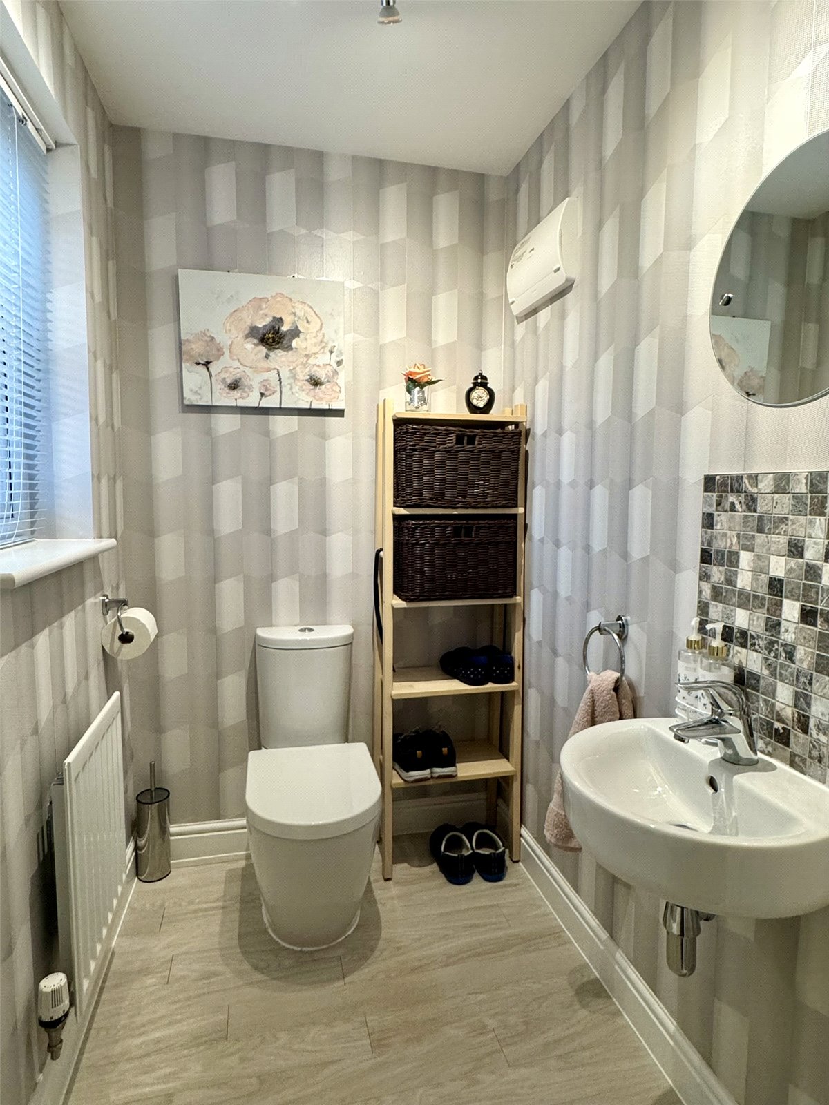 Cloakroom Fitted with a two-piece suite consisting of close coupled W.C and wall mounted wash hand basin. Radiator and opaque double glazed window to the front aspect.