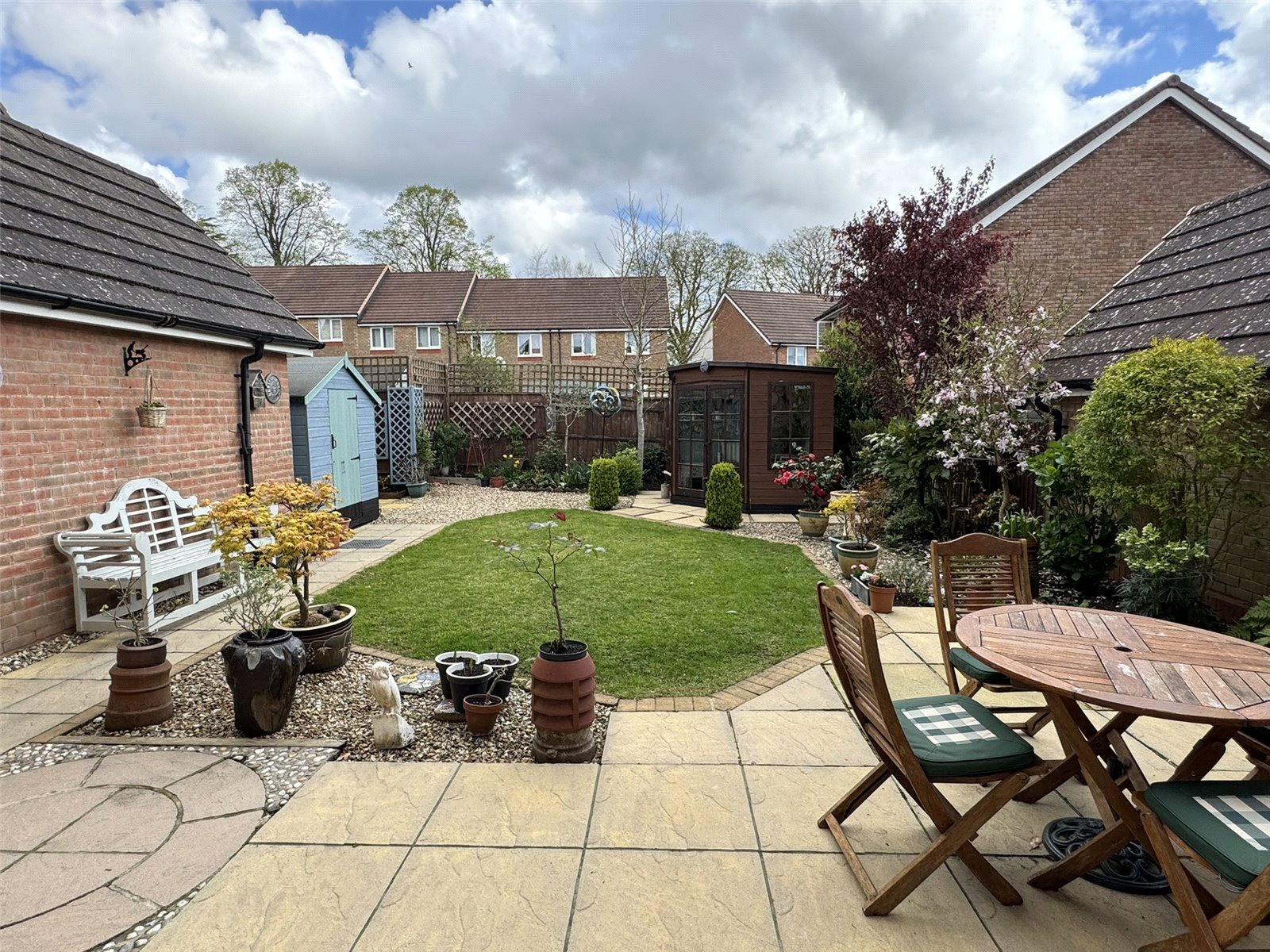 The established rear garden offers a lovely patio seating are leading to an area laid to lawn enclosed by a selection of mature planting, wooden storage shed and summerhouse.